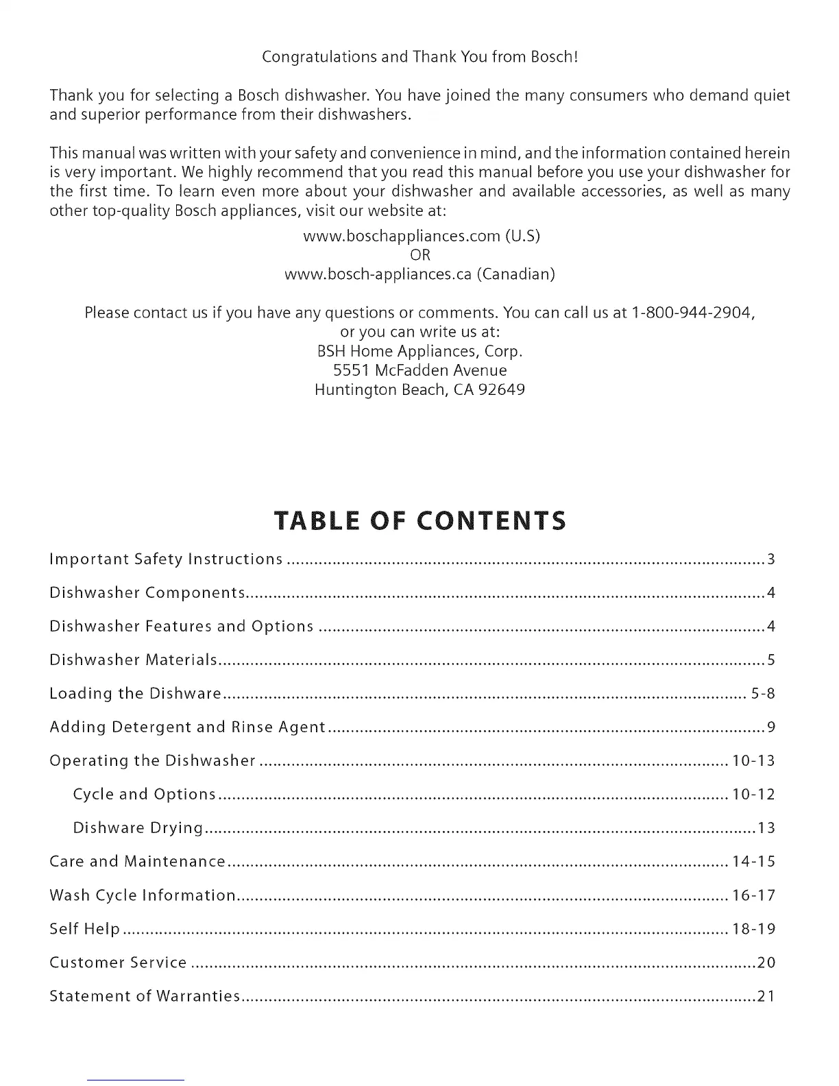 Thank you for selecting a Bosch dishwasher. You have joined the many consumers who demand quiet