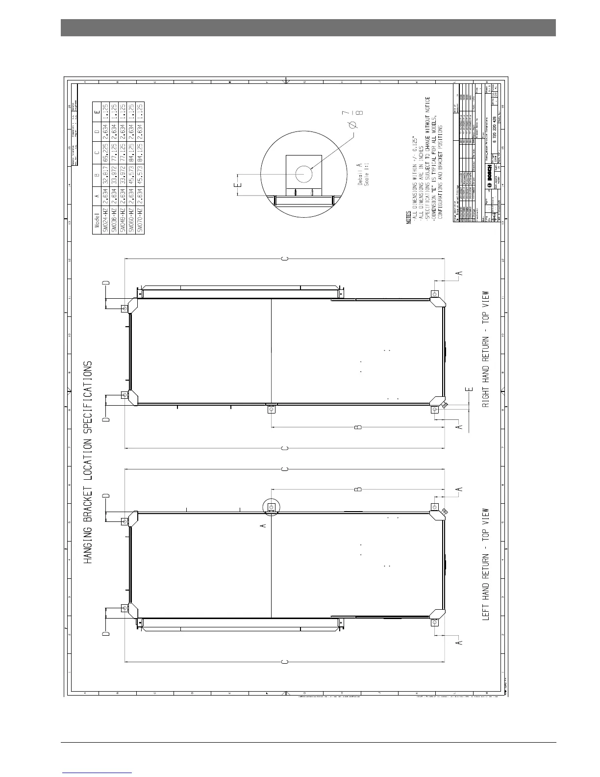 Bosch SM048 - Dimensional Drawings: Horizontal Hanging Bracket Location; Horizontal Hanging Bracket Locations (Figure #142); Horizontal Hanging Bracket Locations Table