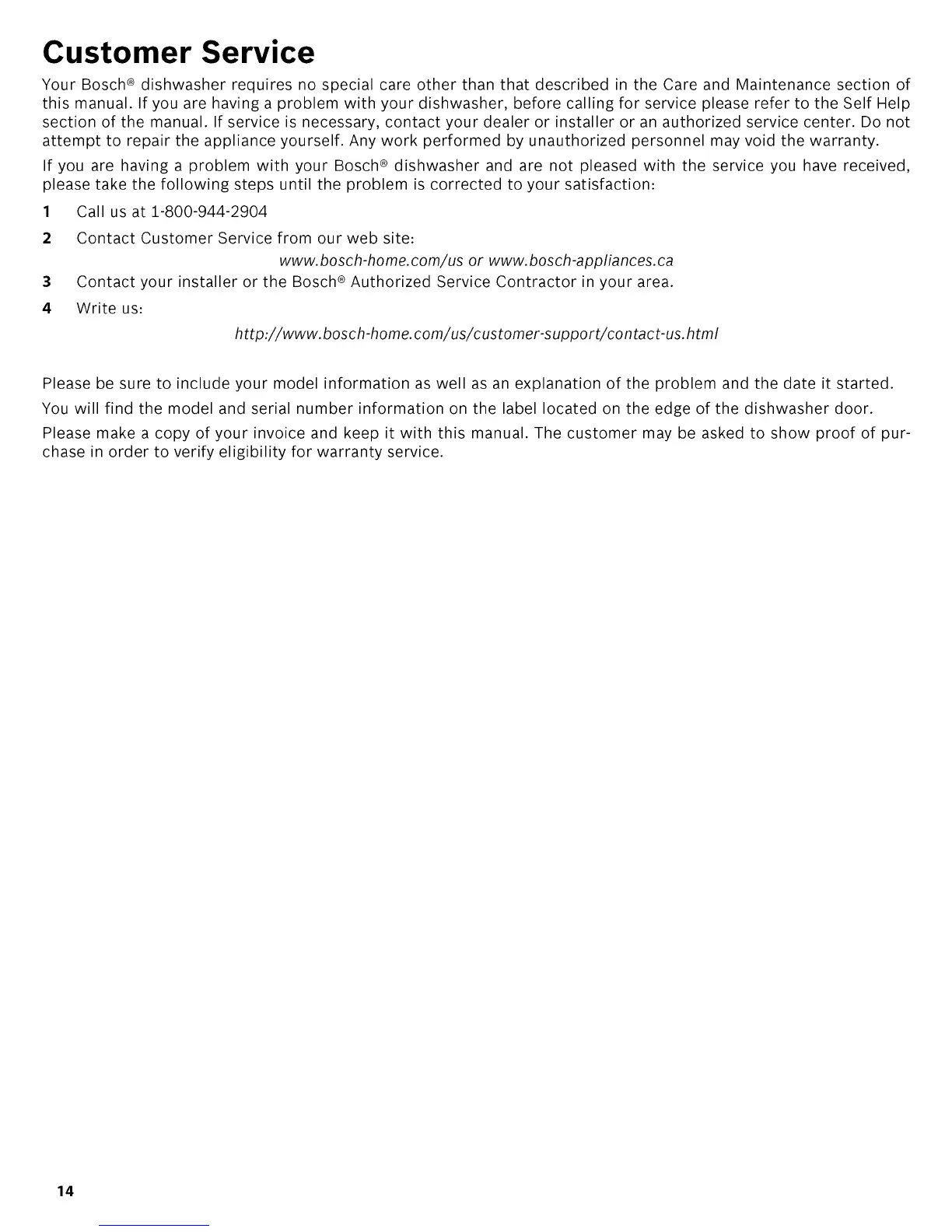 If you are having a problem with your Bosch ® dishwasher and are not pleased with the service you have received,