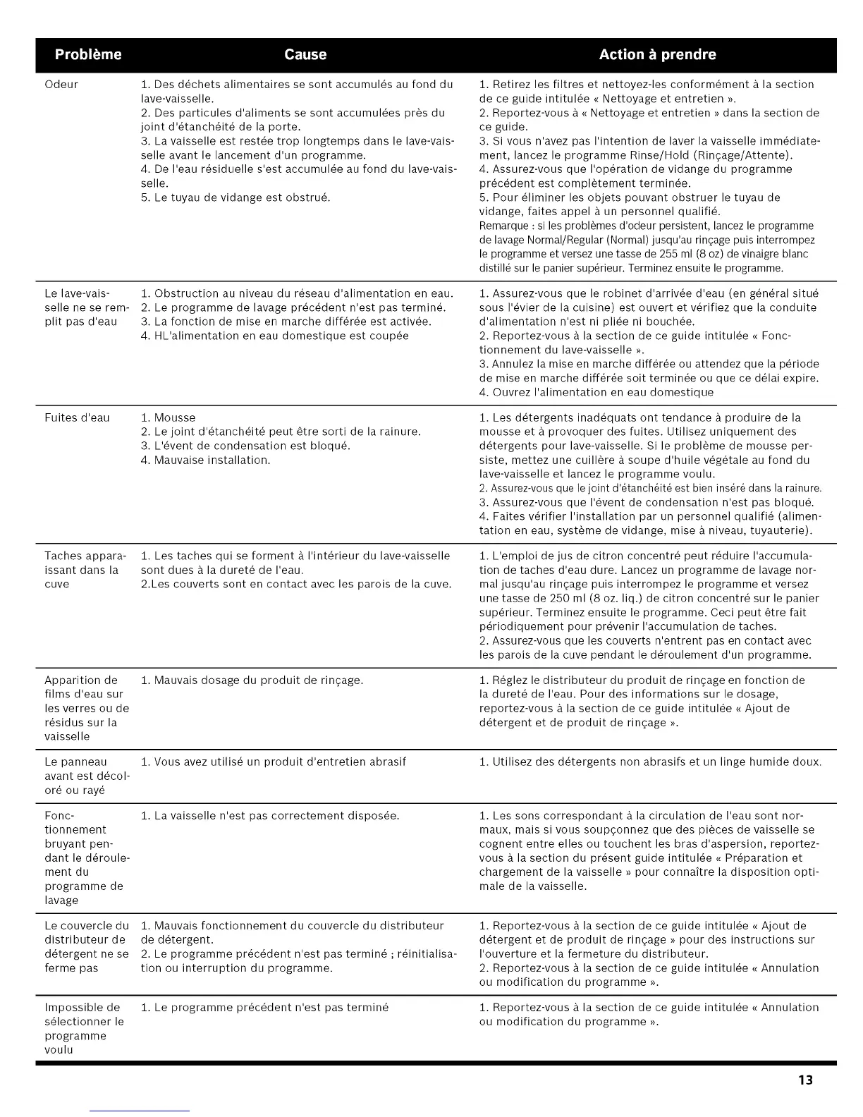 1. La vaisselle n'est pas correctement dispos_e. 1. Les sons correspondant a la circulation de I'eau sont nor-