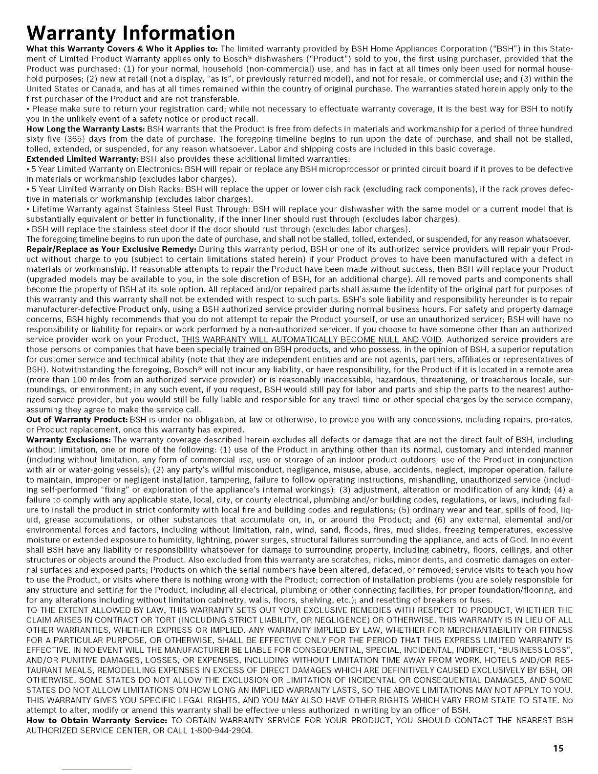 Extended Limited Warranty: BSH also provides these additional limited warranties: