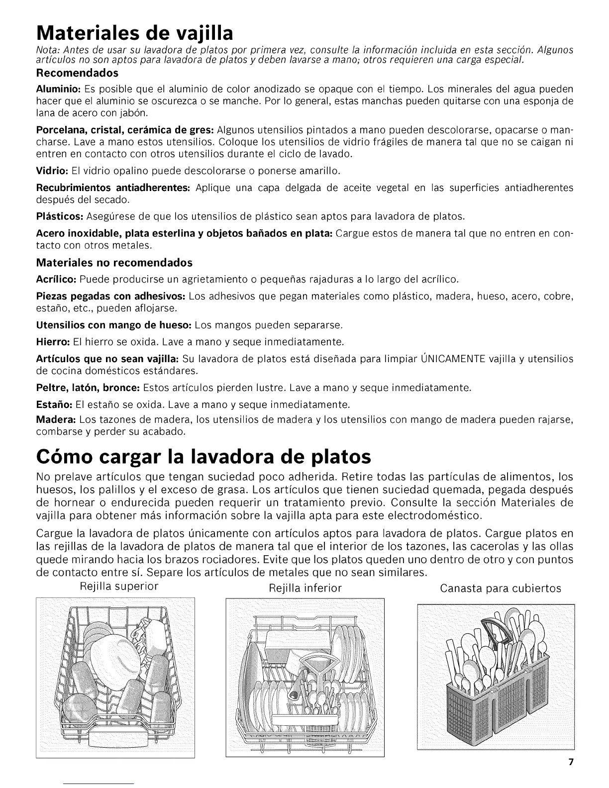 Acero inoxidable, plata esterlina y objetos ba_ados en plata: Cargue estos de manera tal que no entren en con-