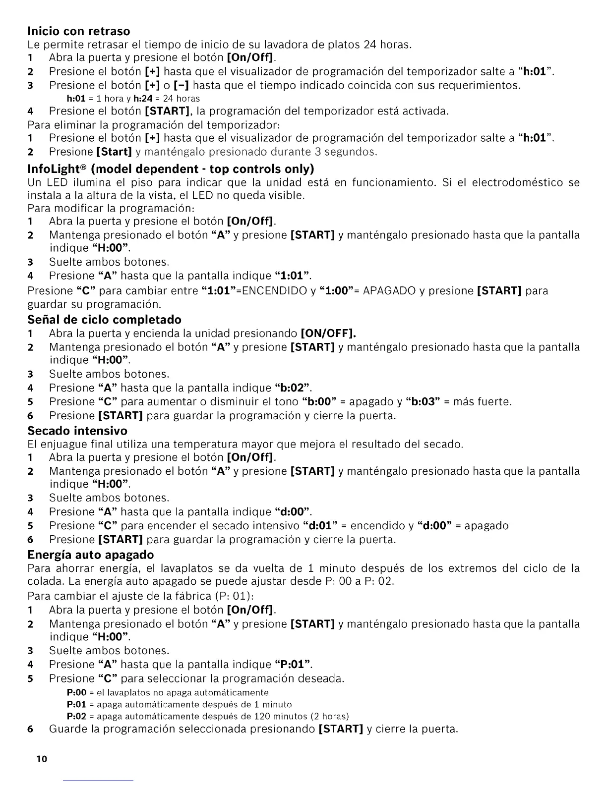 5 Presione "C" para encender el secado intensivo "d:01" = encendido y "d:00" = apasado