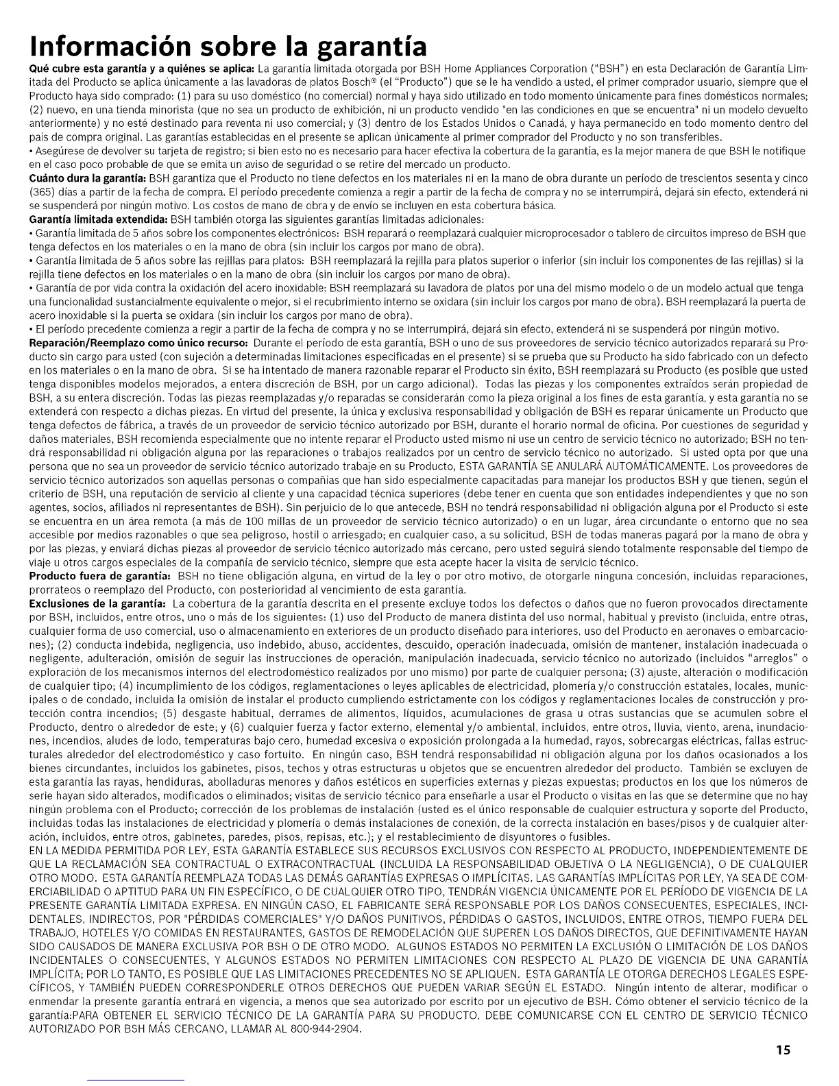 Garantia limitada extendida: BSH tambien otorga las siguientes garantias limitadas adicionales: