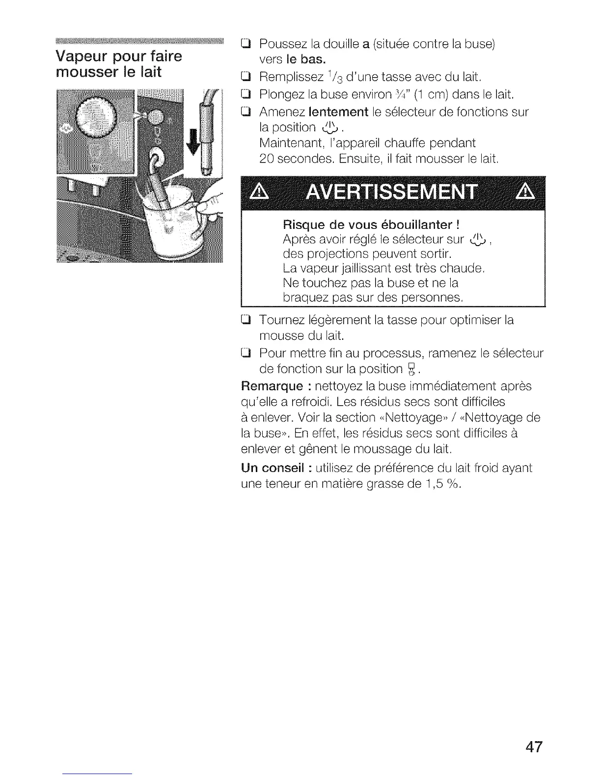 Plongez la buse environ s//" (1 cm) dans le lait.