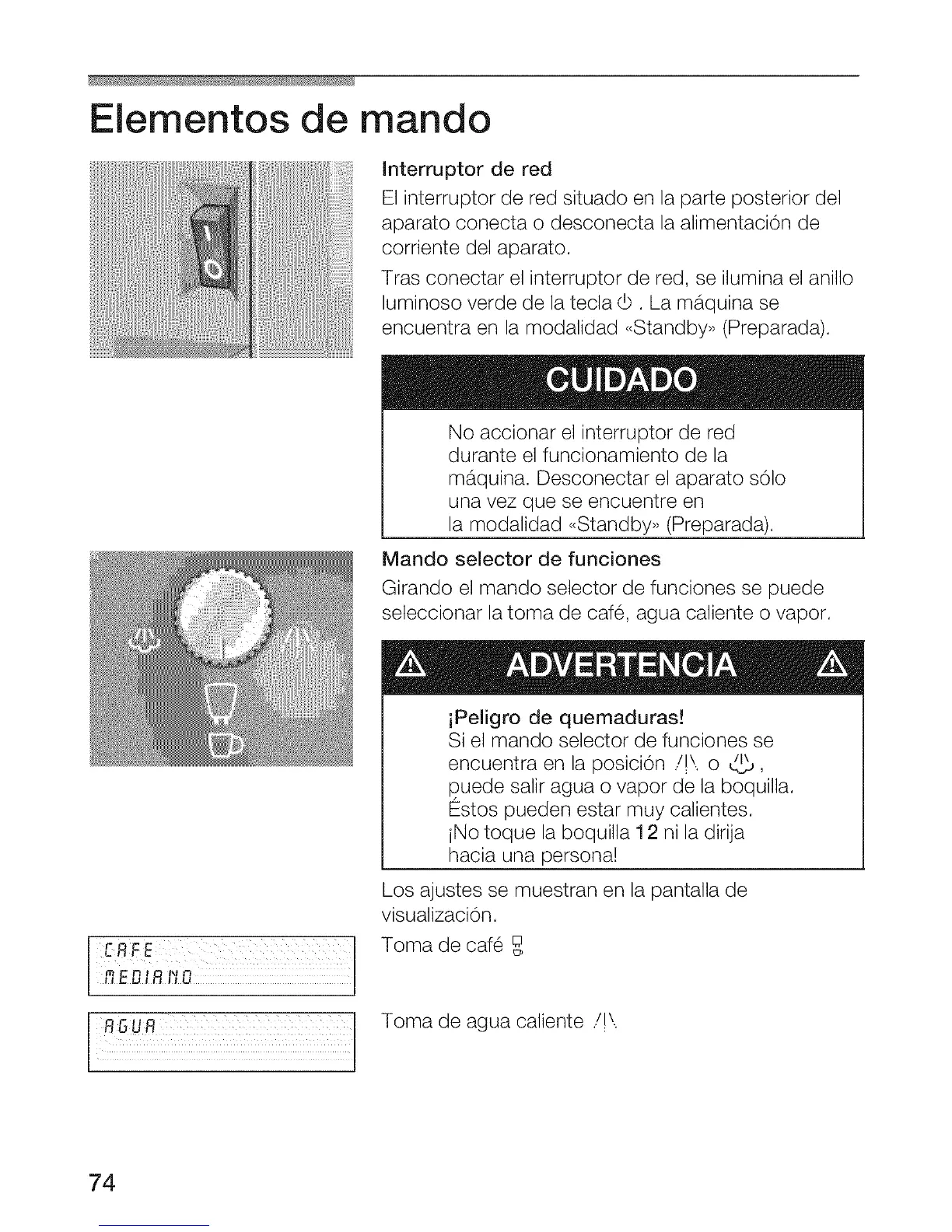 seleccionar la toma de cafe, agua caliente o vapor.