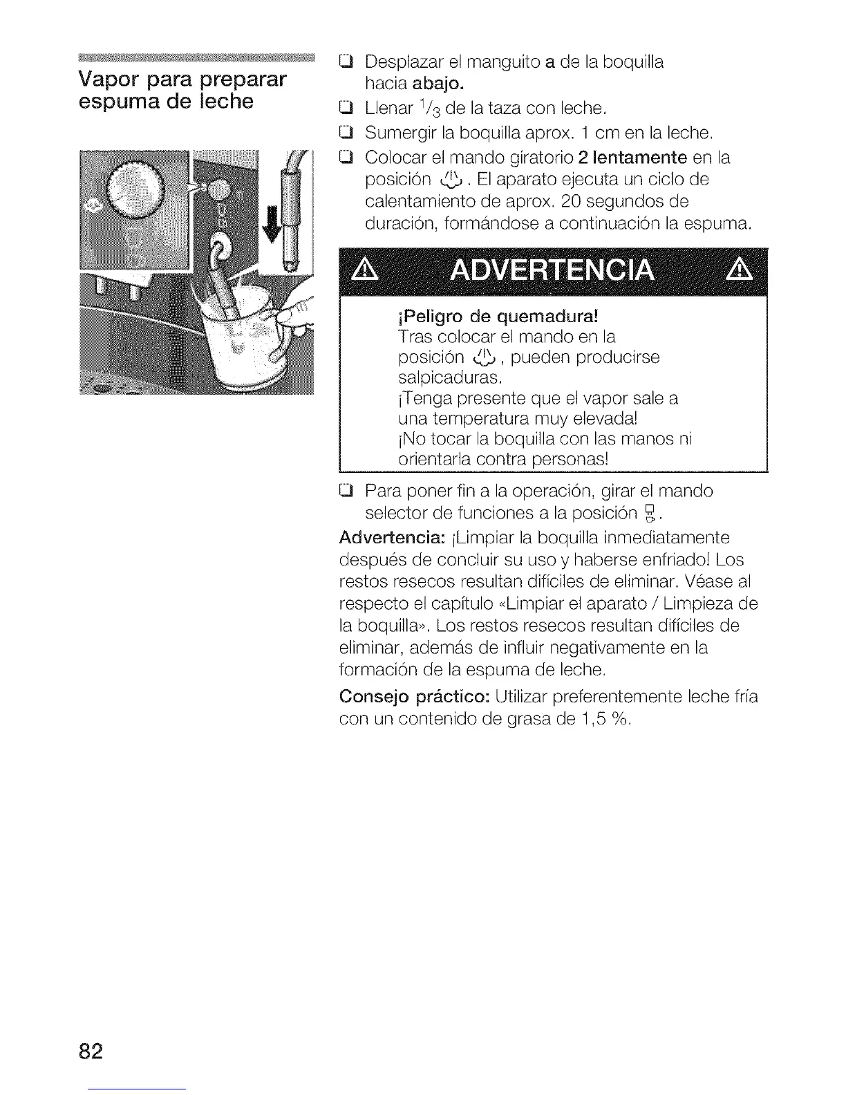 Sumergir la boquilla aprox. 1 cm en la leche.