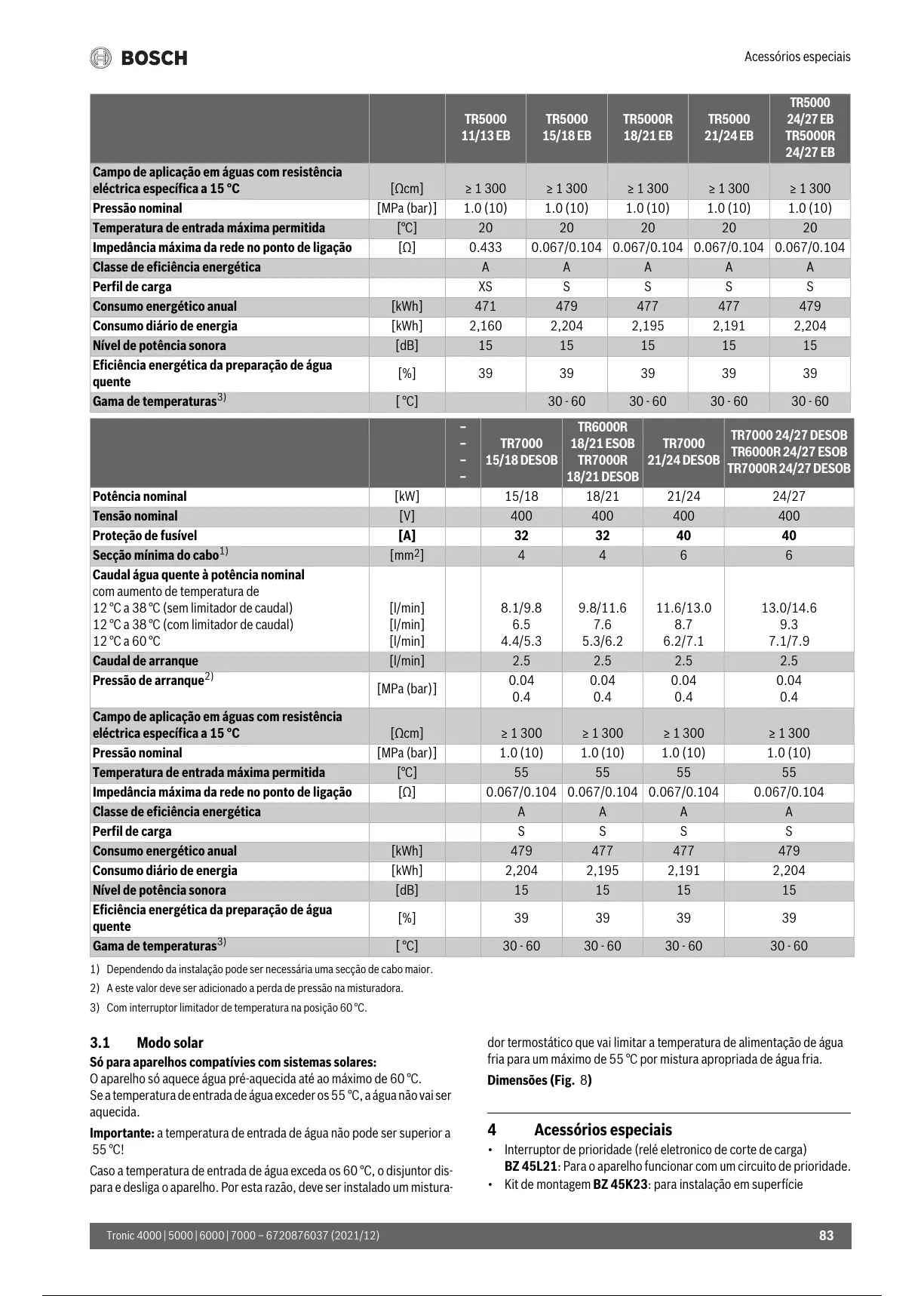 1) Dependendo da instalação pode ser necessária uma secção de cabo maior.