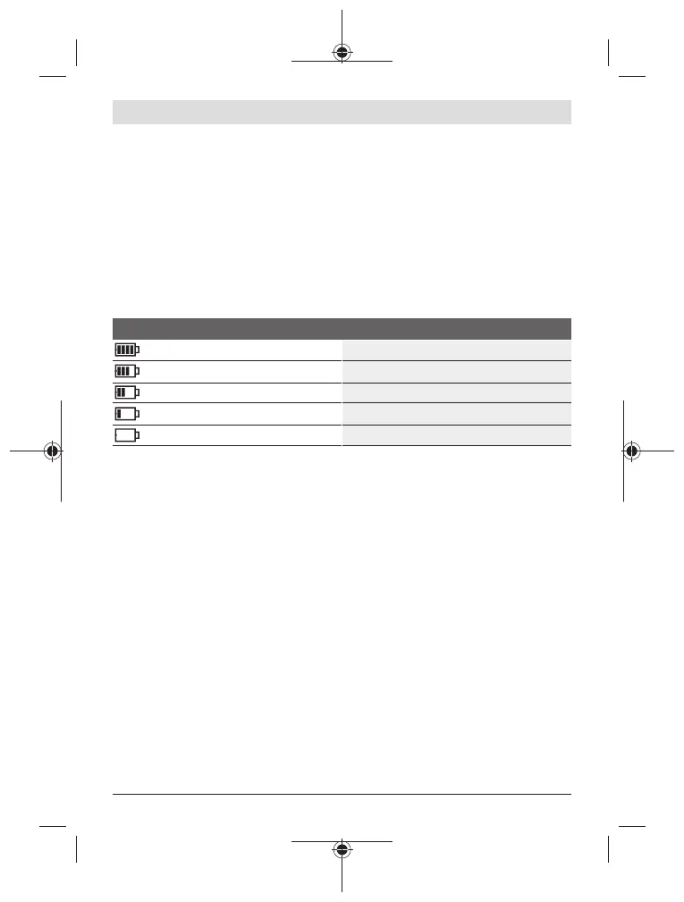 pondent les différents affichages de l’indicateur d’état de charge (e) sur l’écran (3).