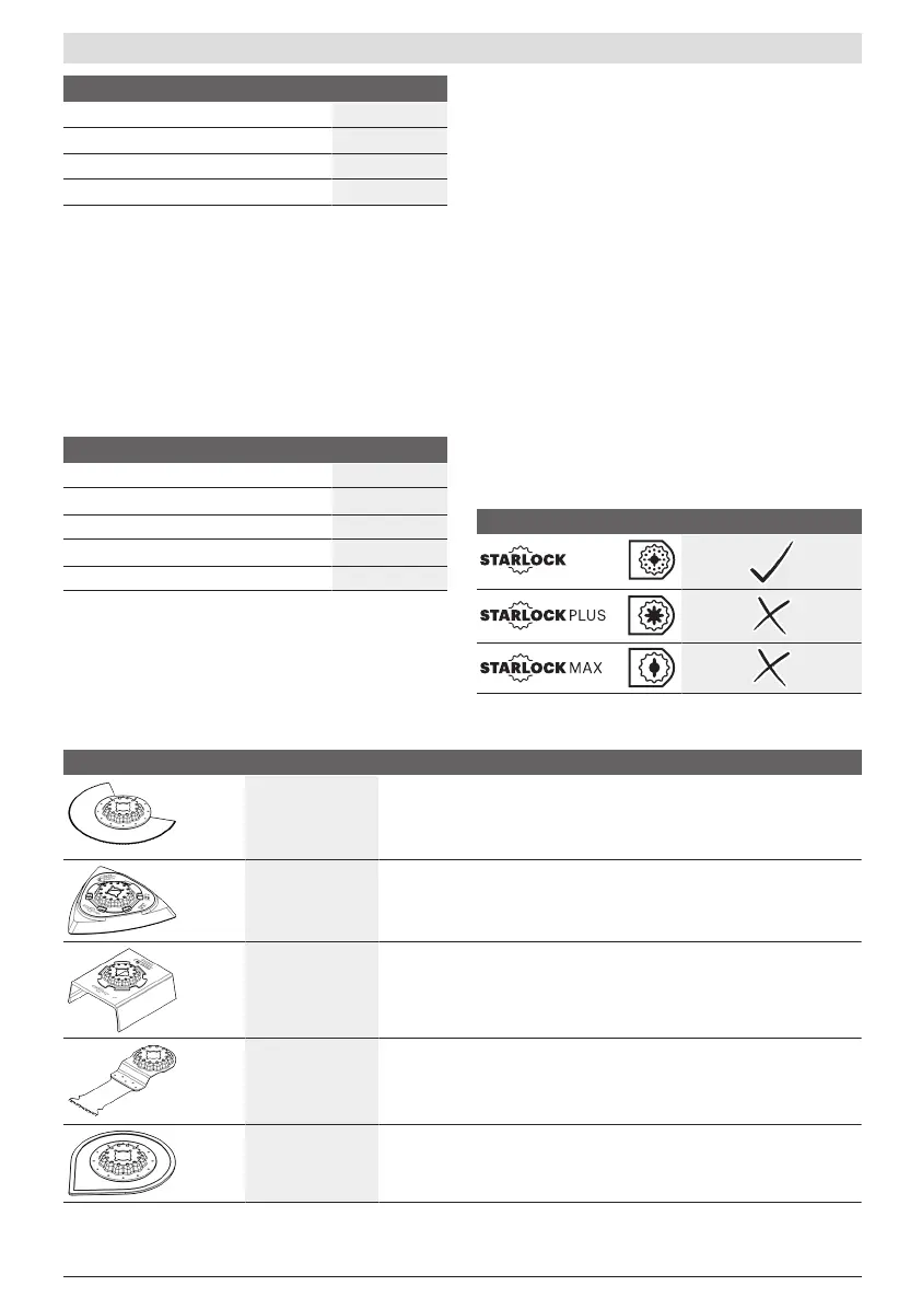 Tabellen nedenfor viser eksempler på innsatsverktøy. Du finner flere innsatsverktøy i Boschs omfattende tilbehørssortiment.