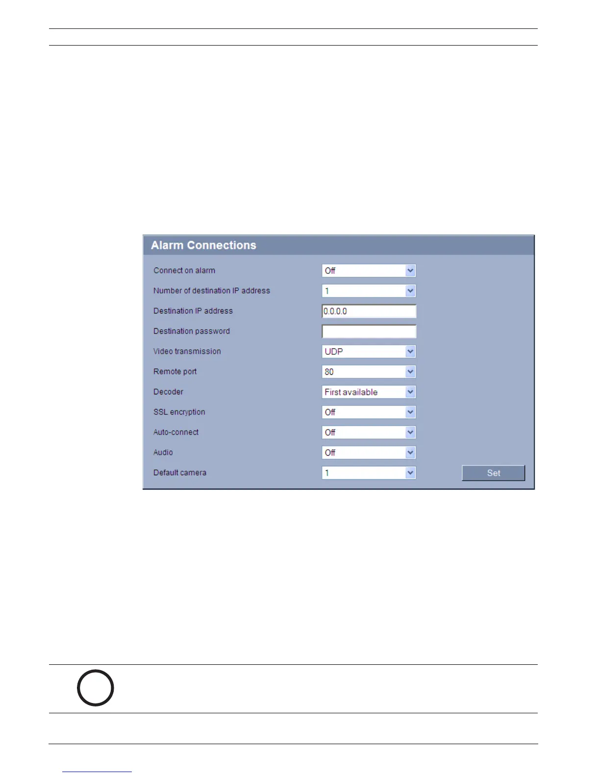the connection as long as an alarm exists on alarm input 1. This option can also be used to