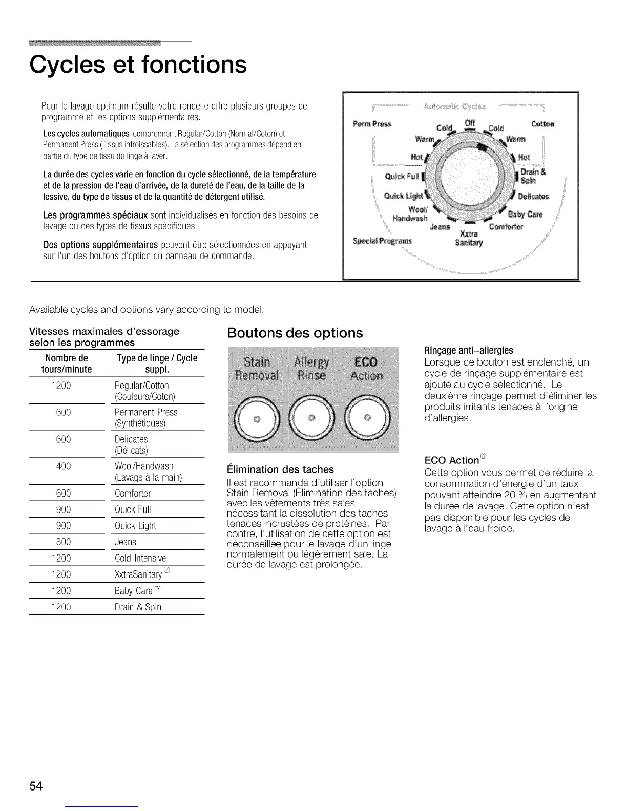 Available cycles and options vary according to model.