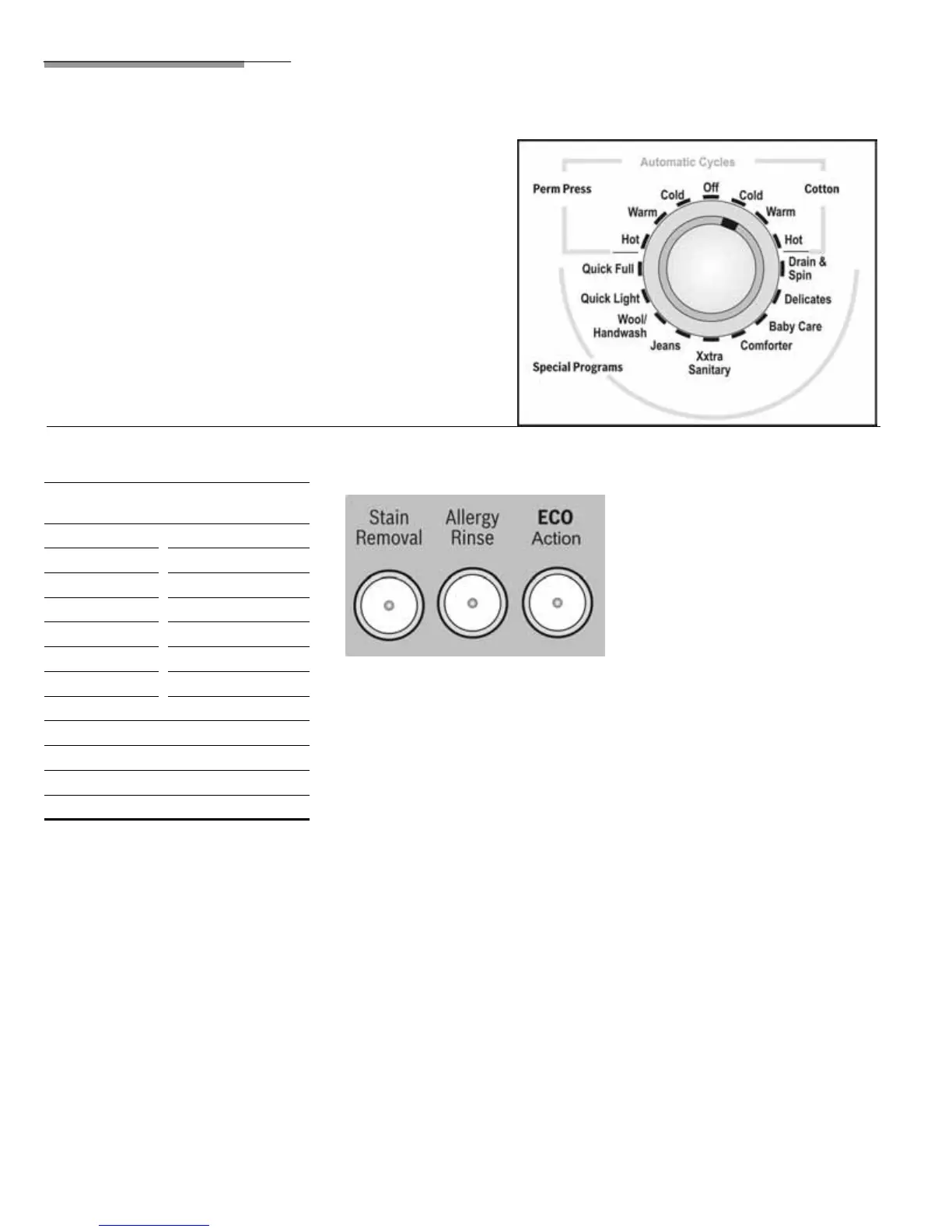 Bosch Vision 500 - Cycles and Options; Maximum spin speeds of the cycles; Option Buttons
