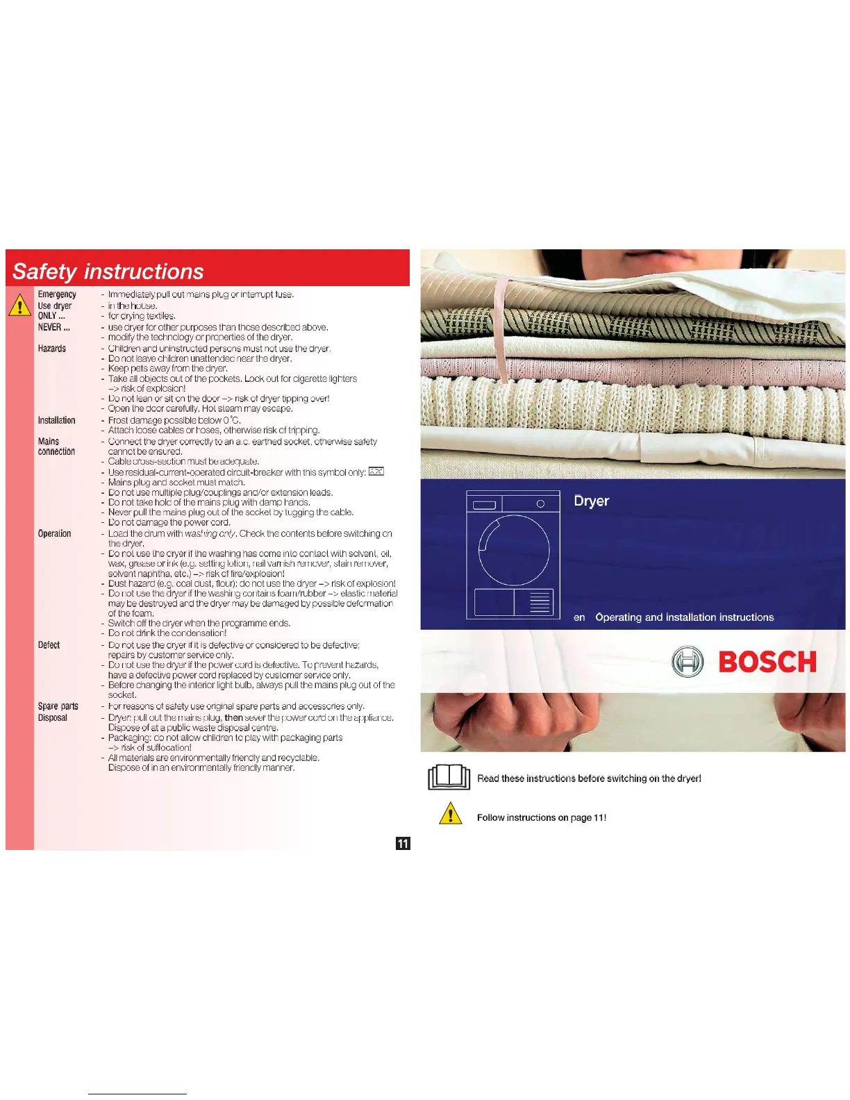 Bosch WTE8611XEE - Safety Instructions; Emergency Procedures; Safe Dryer Usage; Installation and Mains Connection Safety