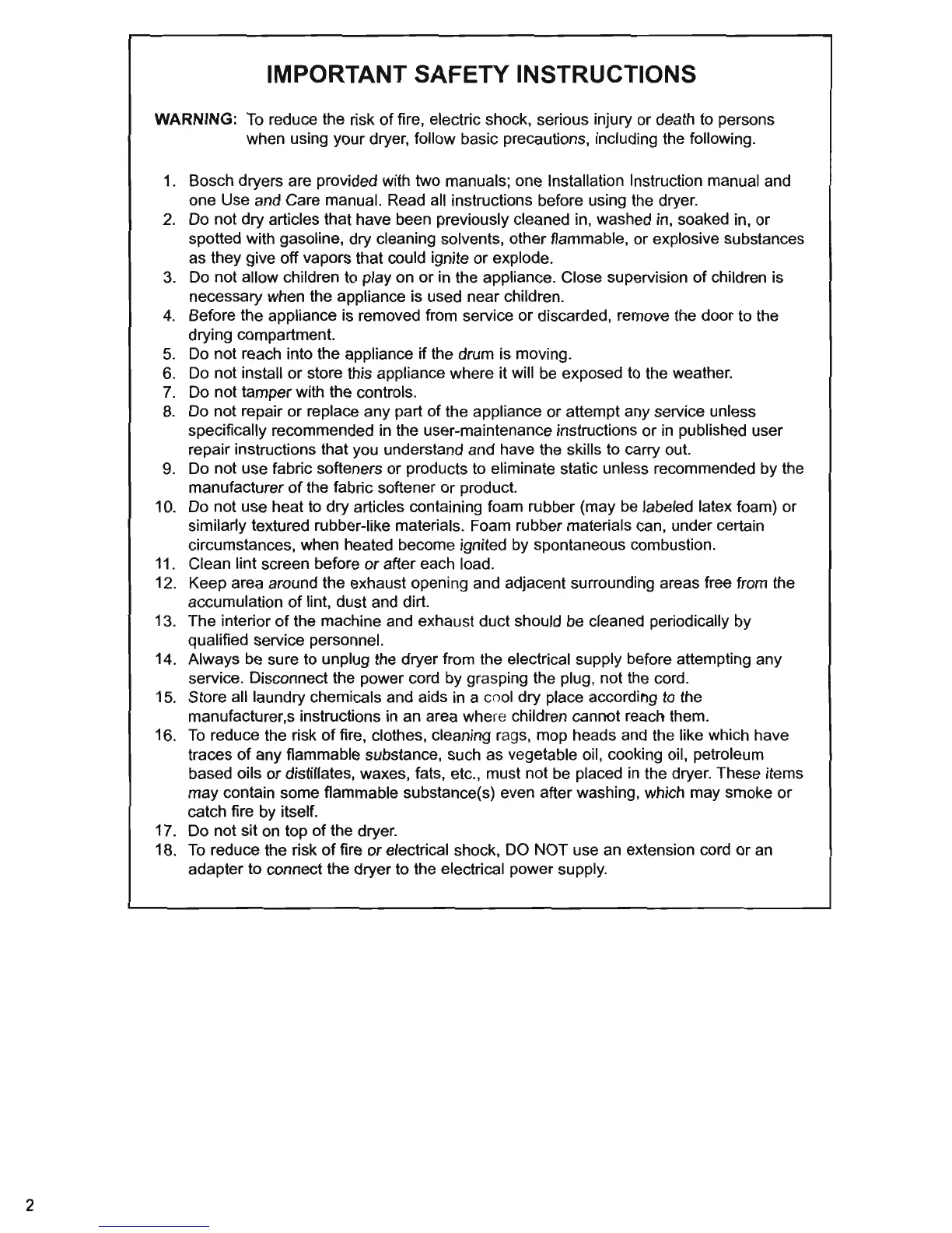 Bosch dryers are provided with two manuals; one Installation Instruction manual and