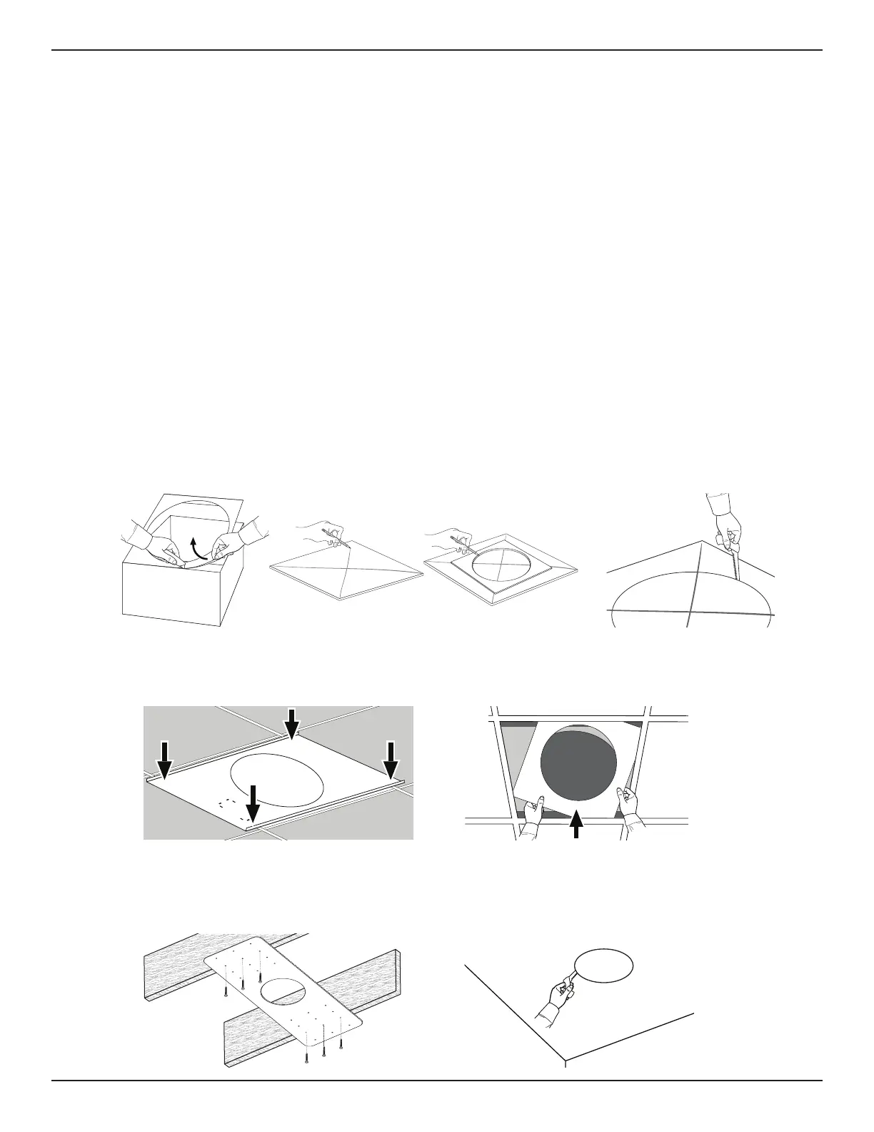 2. Po przygotowaniu sufitu wyciąć otwór w suficie, korzystając z otworów w podkładce jako punktów odniesienia.