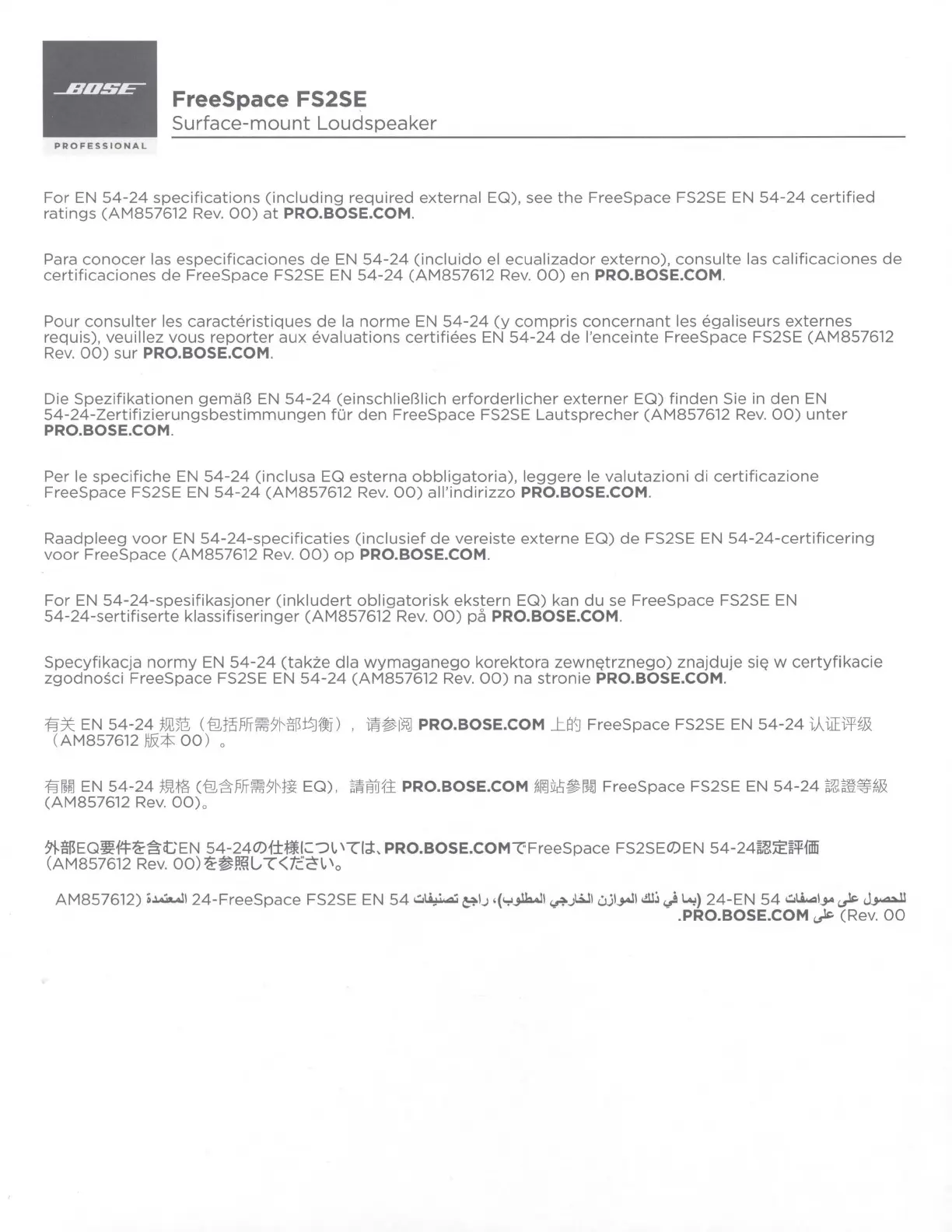 Bose Professional FreeSpace FS2SE - EN 54-24 Specifications Reference; Multilingual Information