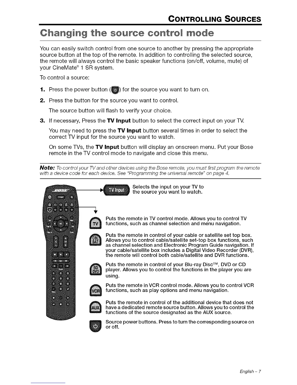 Note: Tocontrol your 7-Vand other devices using the Bose remote, you must first program the remote