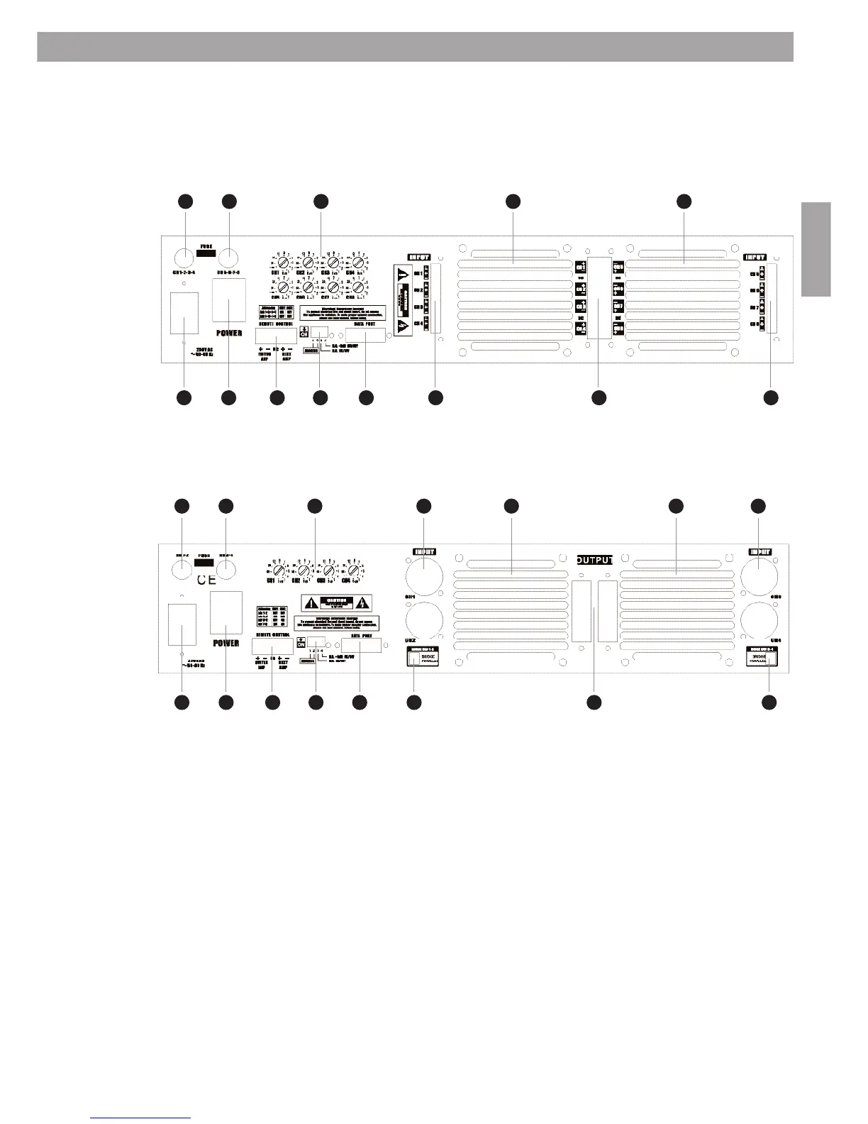 16. DIP-switch til stereomode, parallel mode og bridge mode, kanal 1 og 2