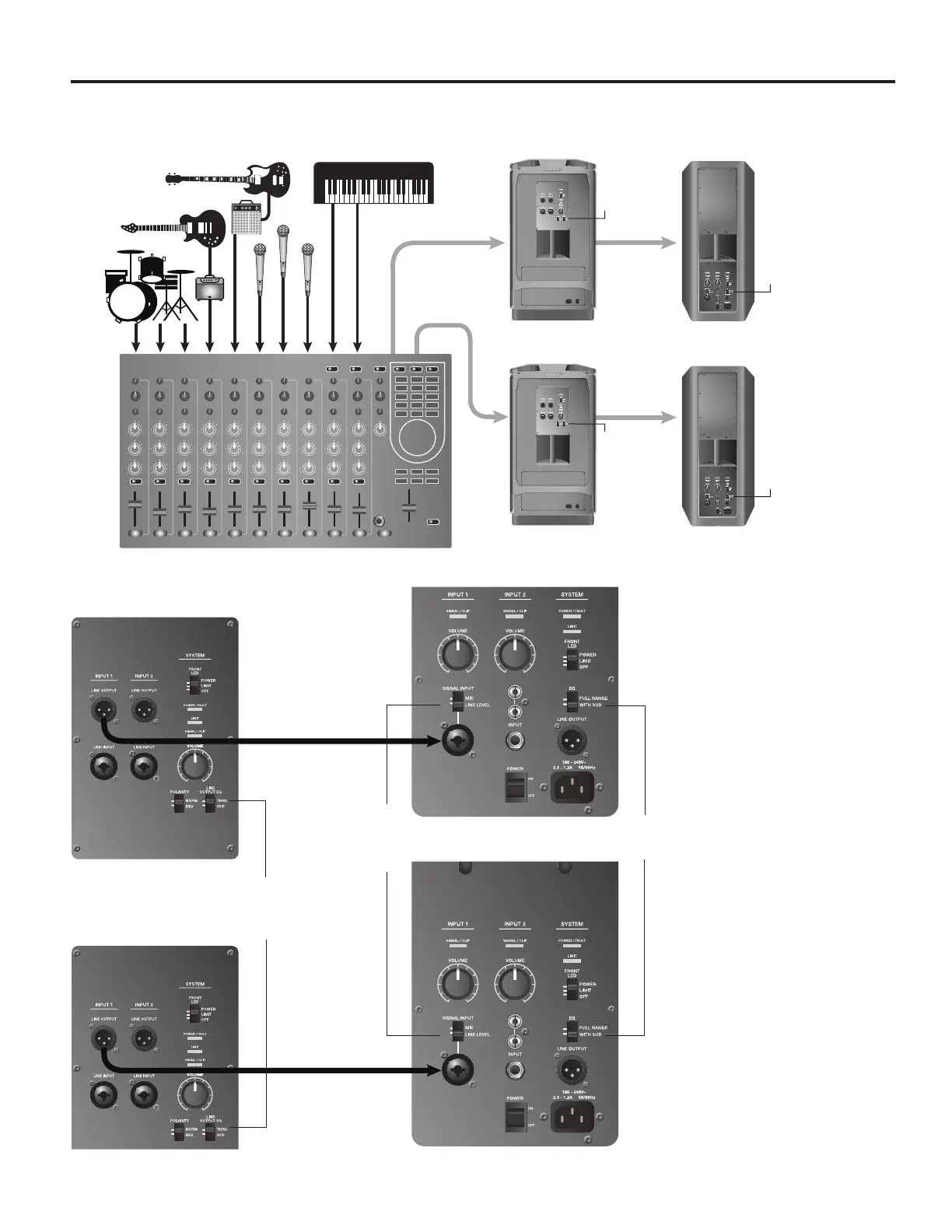 Volledige band met stereo-uitvoer voor mengpaneel naar twee F1 subwoofers en twee F1 Model
