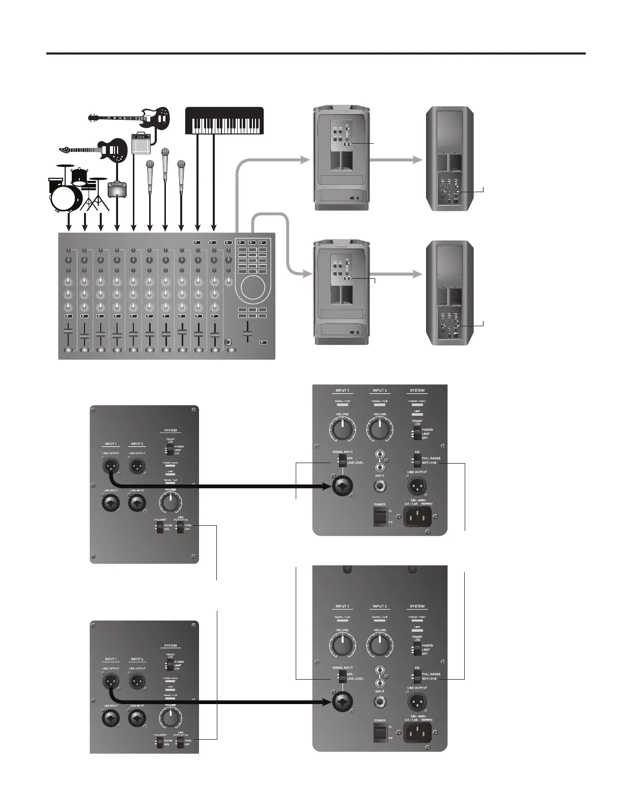 Ensemble instrumental avec sortie stéréo de la console de mixage vers deux caissons de bassesF1 et
