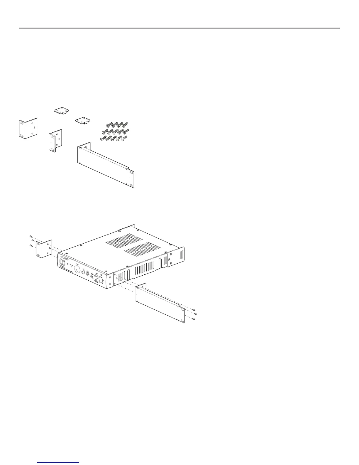 1. Attach one short rack ear to one side of the amplifier chassis with three (3) of the included screws.