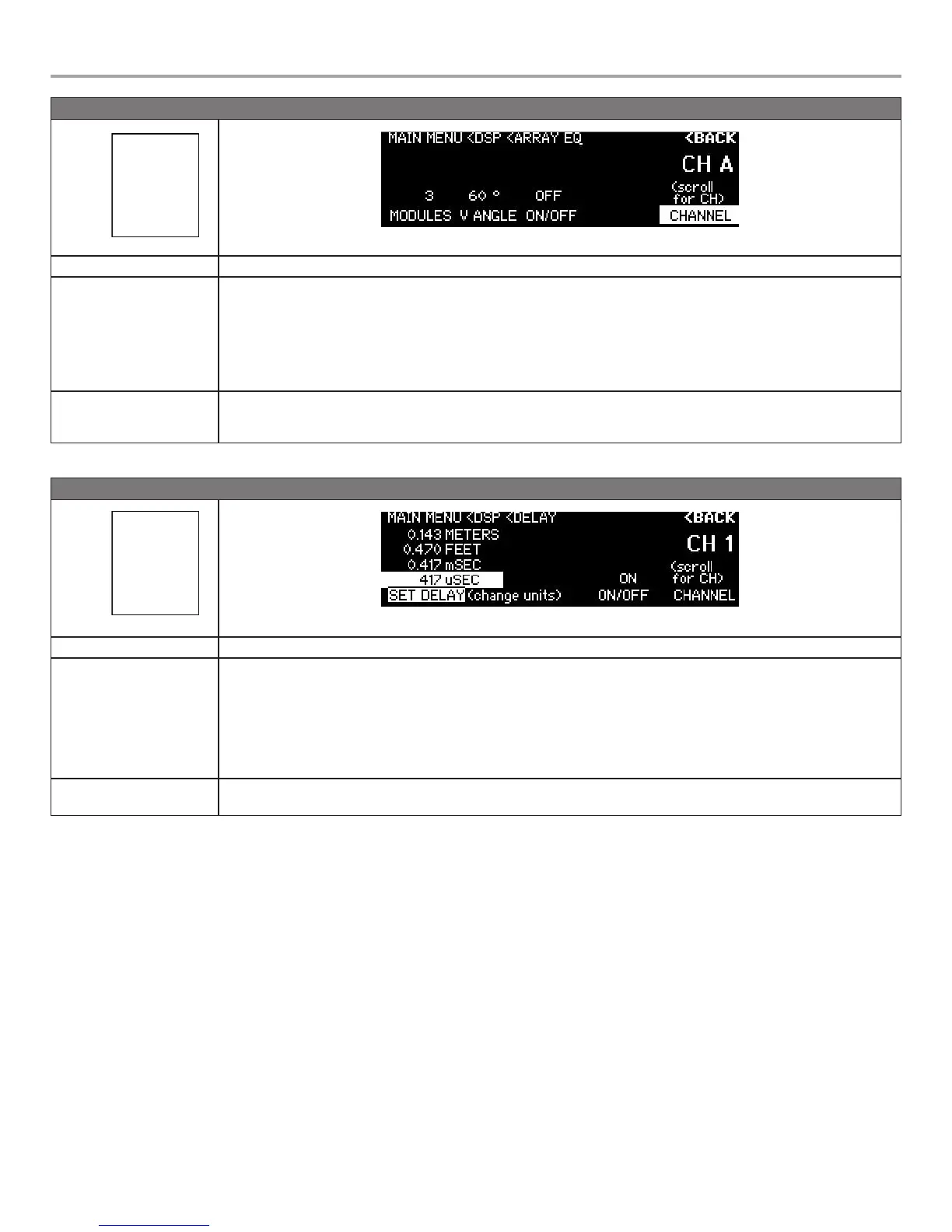 Available Controls To access Array EQ, use the rotary encoder dial from the DSP menu to highlight, then press to select.
