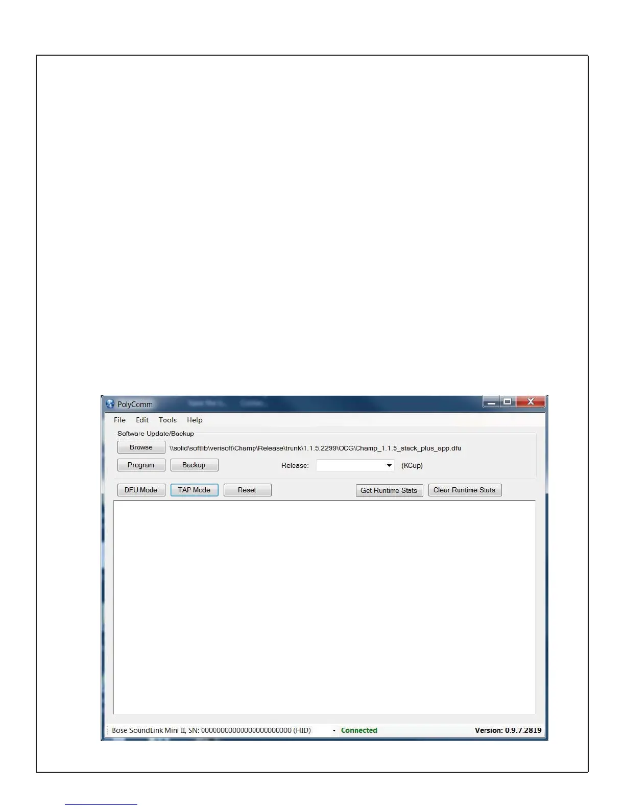 Note: The Polycomm tool will only be used to issue TAP commands. Software updates should be per-
