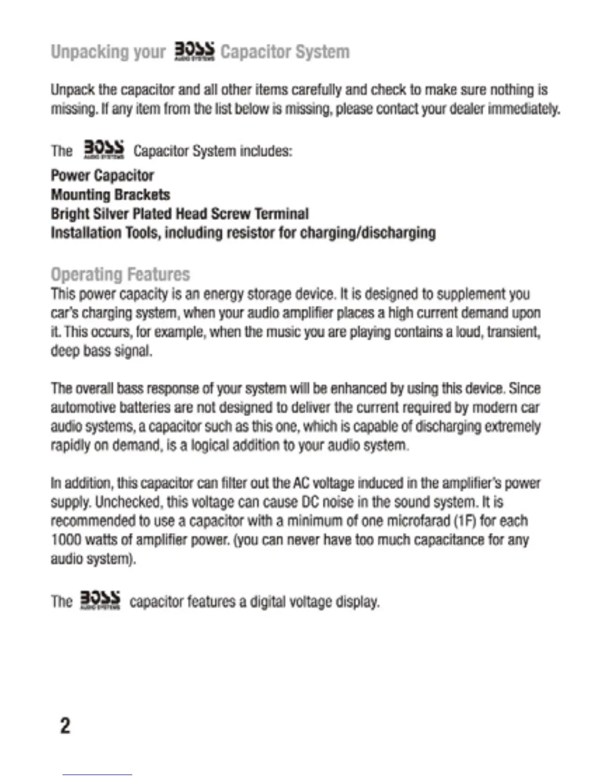 Boss Audio Systems CAP2CR - Unpacking your BOSS Capacitor System; Operating Features