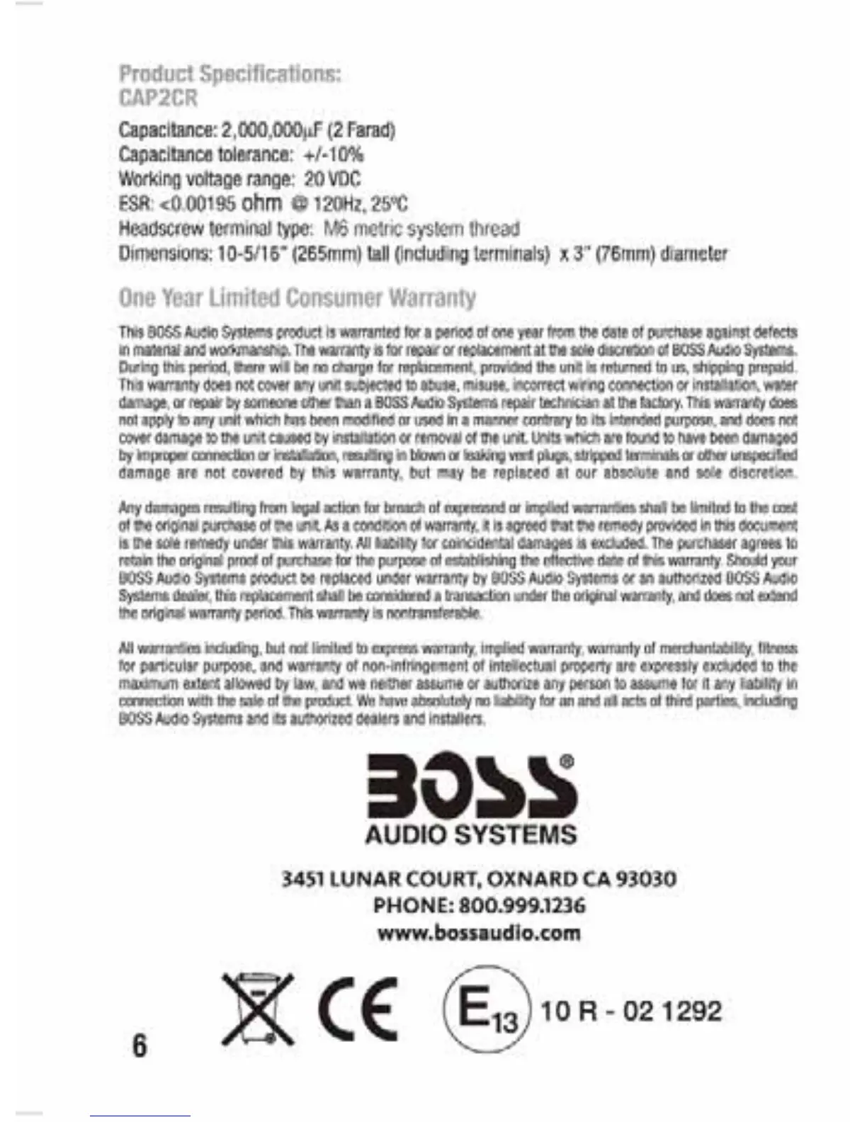 Boss Audio Systems CAP2CR - Product Specifications; One Year Limited Consumer Warranty