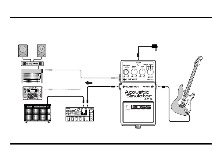 The CHECK indicator is off, the guitar sound (with effect off) is output from the AC-3: G.AMP