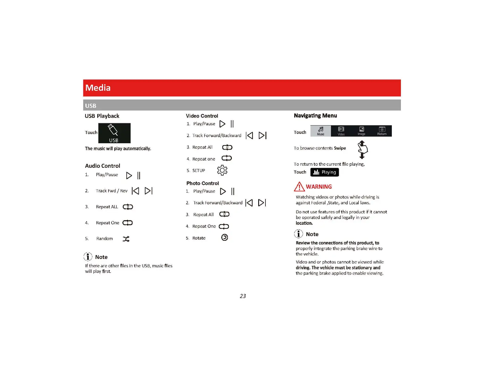 Boss BE9ACP - Media; Warnings; USB Playback; Navigating Menu