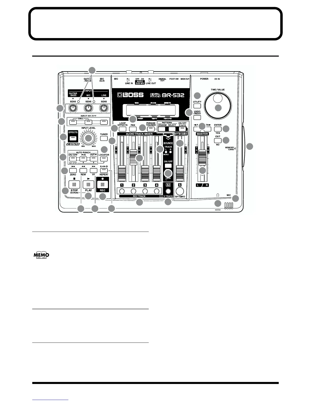 various input jacks (e.g., GUITAR/BASS and MIC).