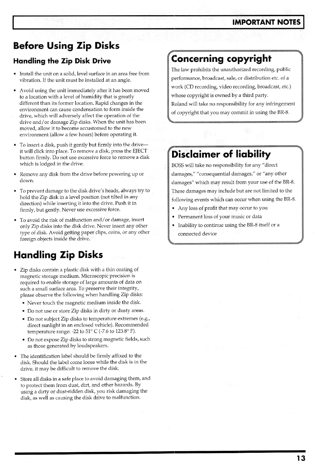 Boss BR-8 - Before Using Zip Disks; Handling Zip Disks; Handling the Zip Disk Drive