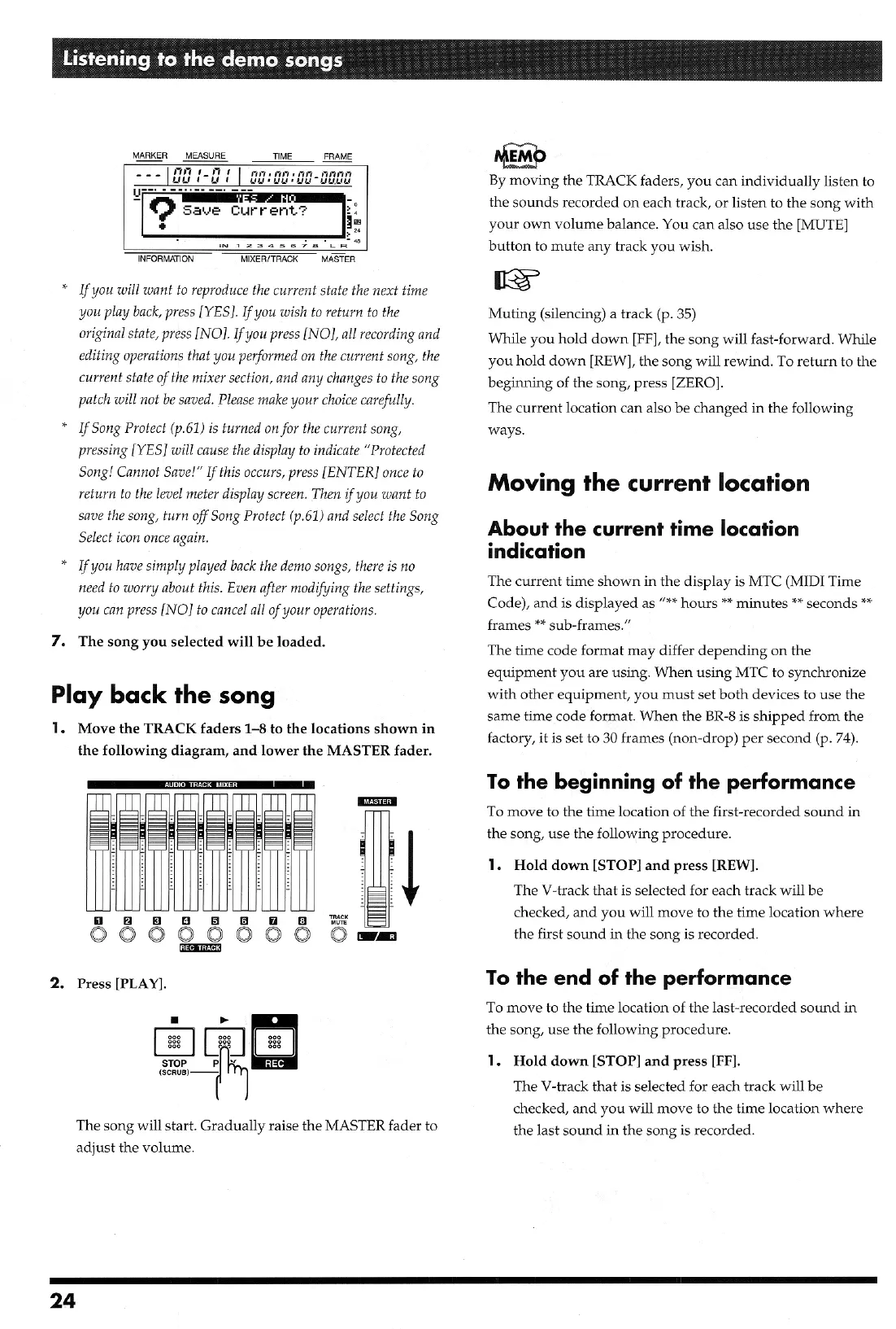 Boss BR-8 - Play Back the Song; Moving the Current Location; About the Current Time Location Indication; To the Beginning of the Performance