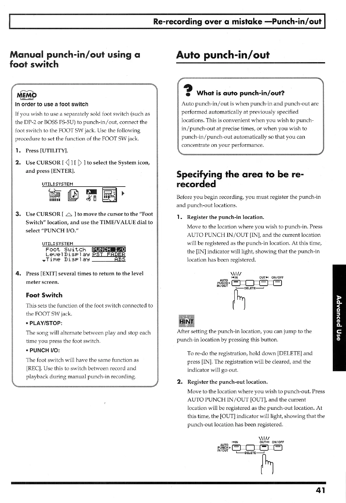 Boss BR-8 - Auto Punch-In;Out; Manual Punch-In;Out Using a Foot Switch; Specifying the Area to be Recorded