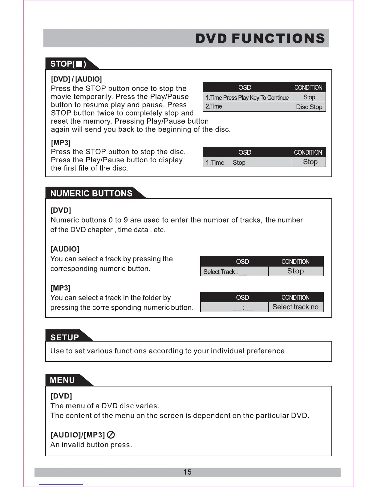 Boss BV11.2MC - DVD Functions - Navigation and Setup; Stop, Numeric, and Menu Navigation