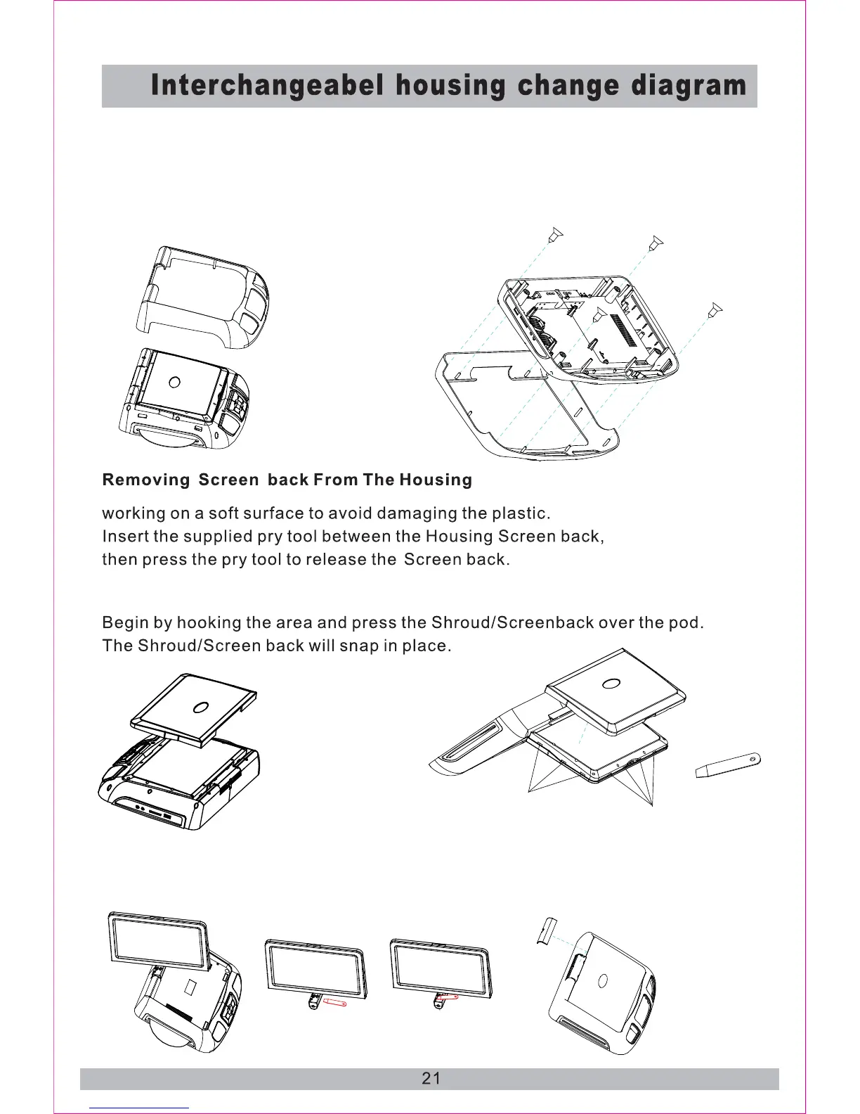 Begining by hooking the area and press the shroud over the pod. The shroud will snap in