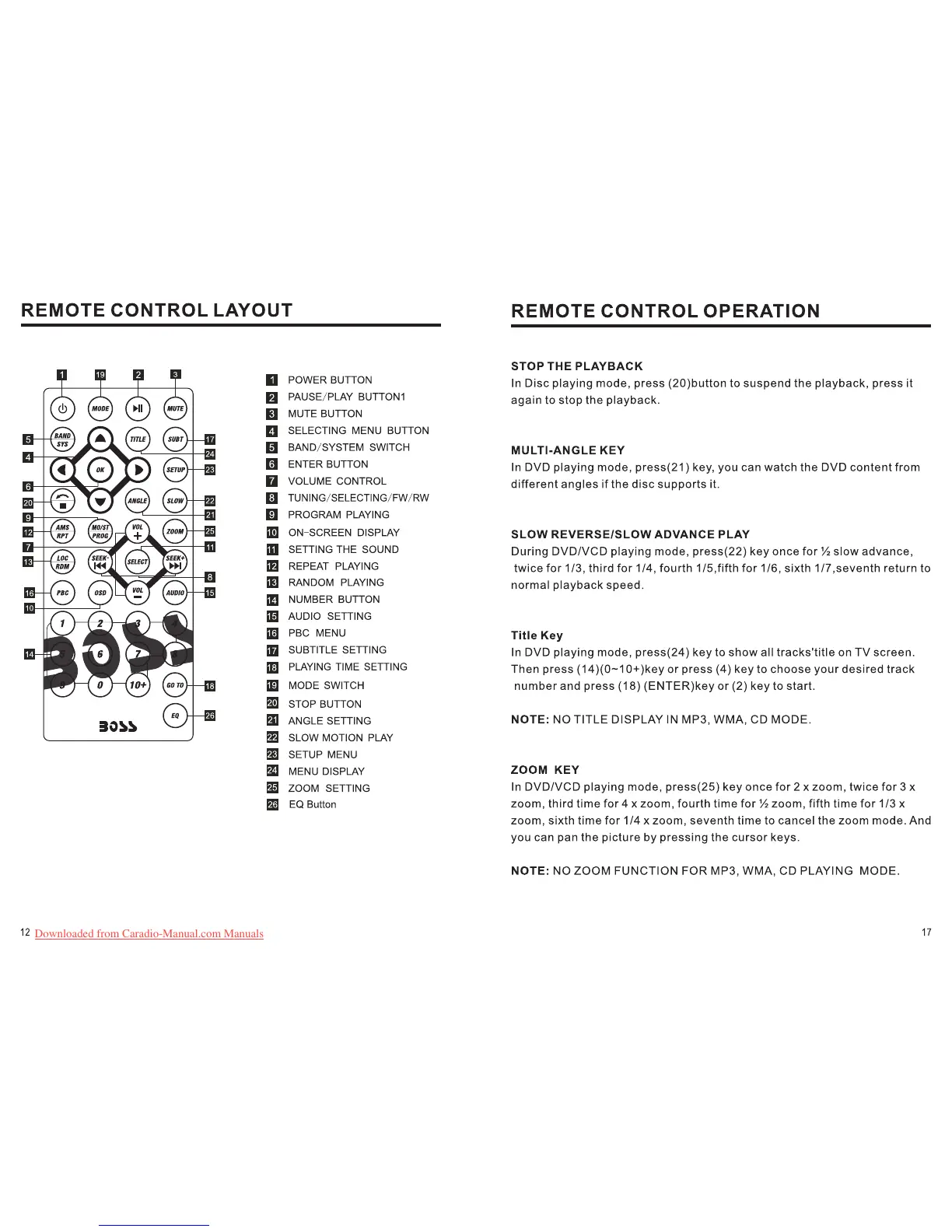 Boss BV6550 - Remote Control Layout; Button Functions