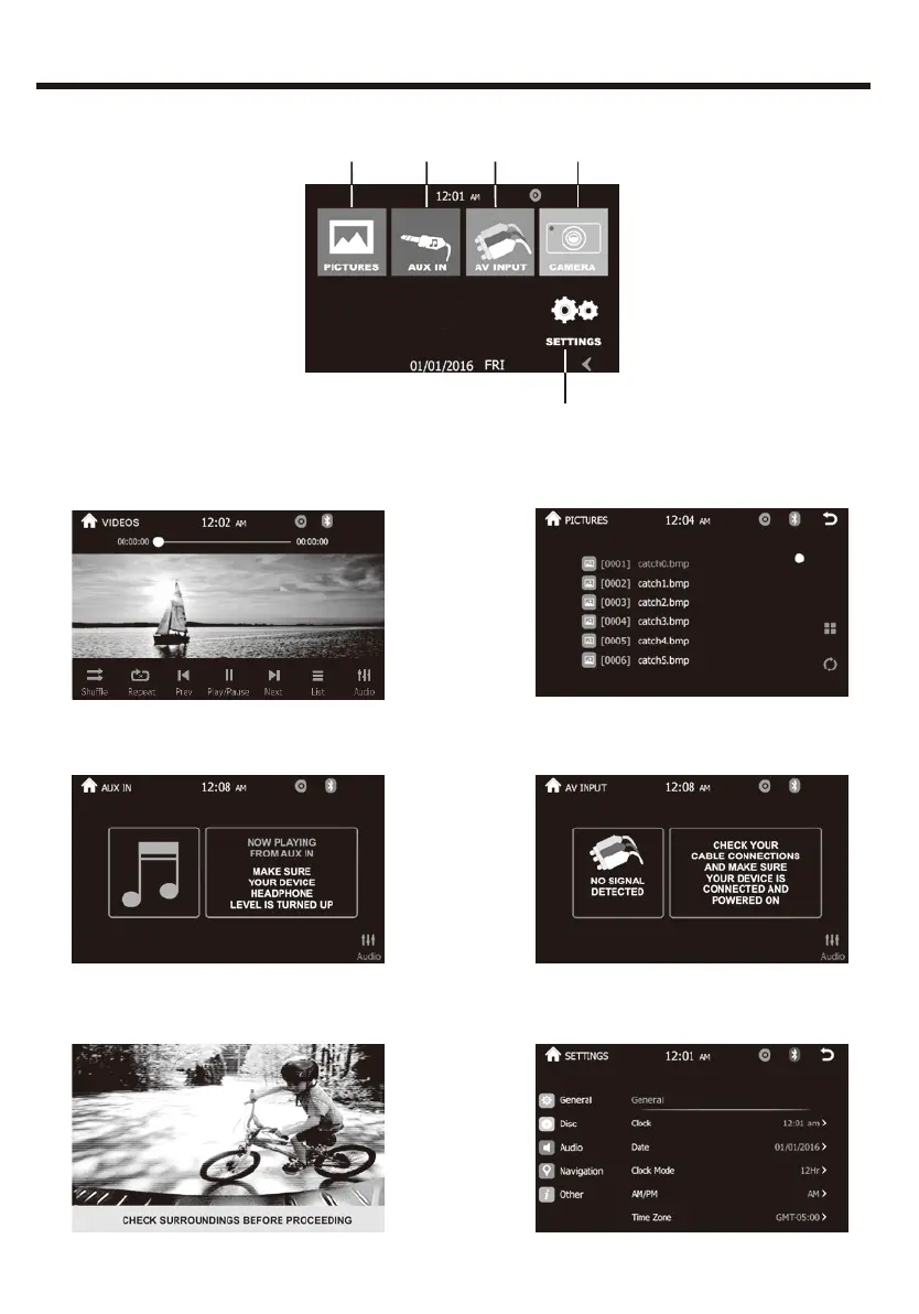 Boss BV960NV - Music, Video, Picture, and Aux Inputs; AV No Signal and Settings Menu