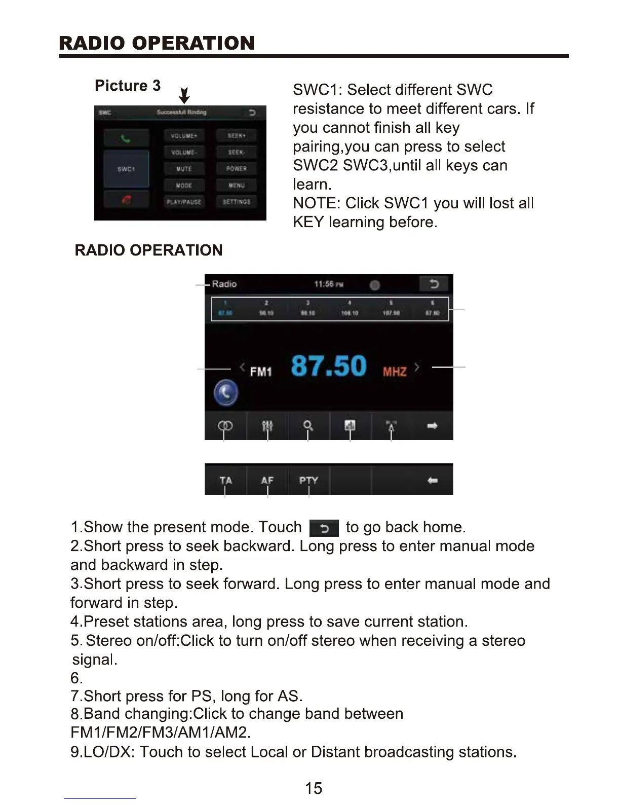 Boss BV9967B - Radio Operation; SWC Binding Confirmation; Radio Interface Overview; Seek and Preset Functions