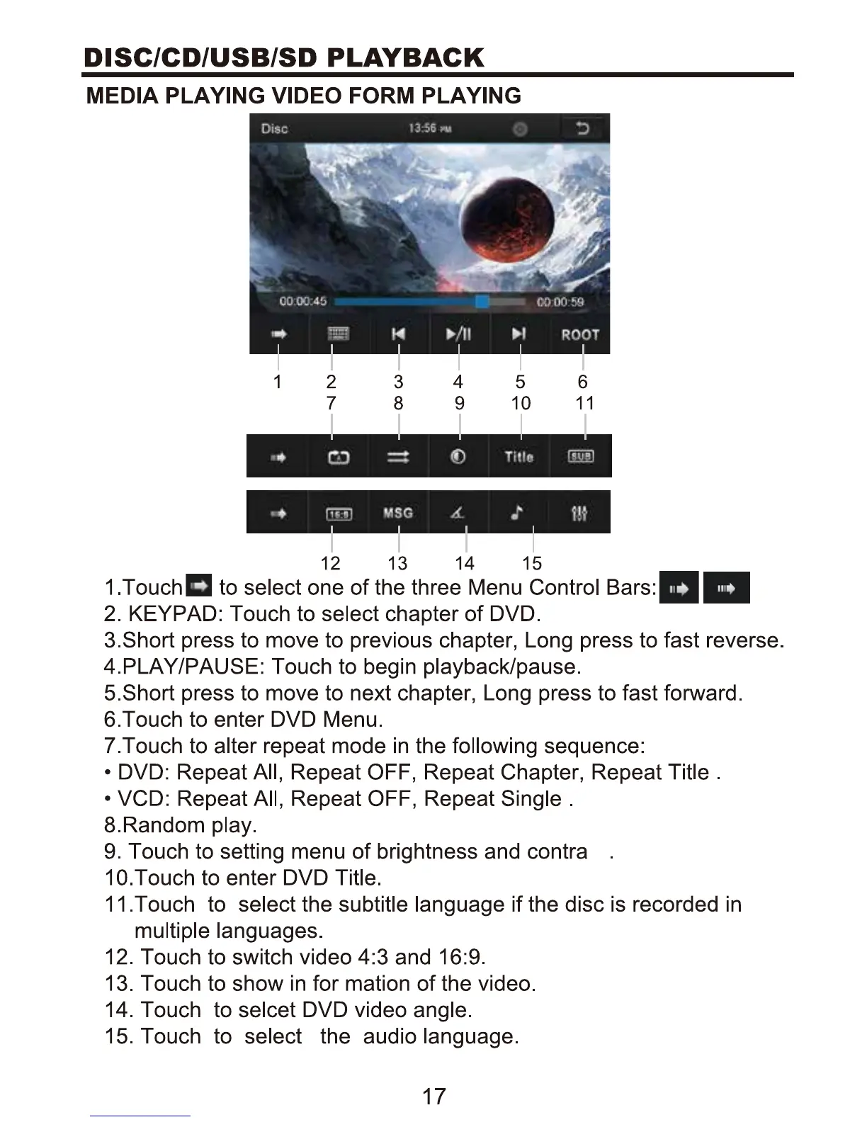 Boss BV9967B - Disc;CD;USB;SD Playback; Video Playback Controls; Repeat and Random Play; Media Settings and Navigation