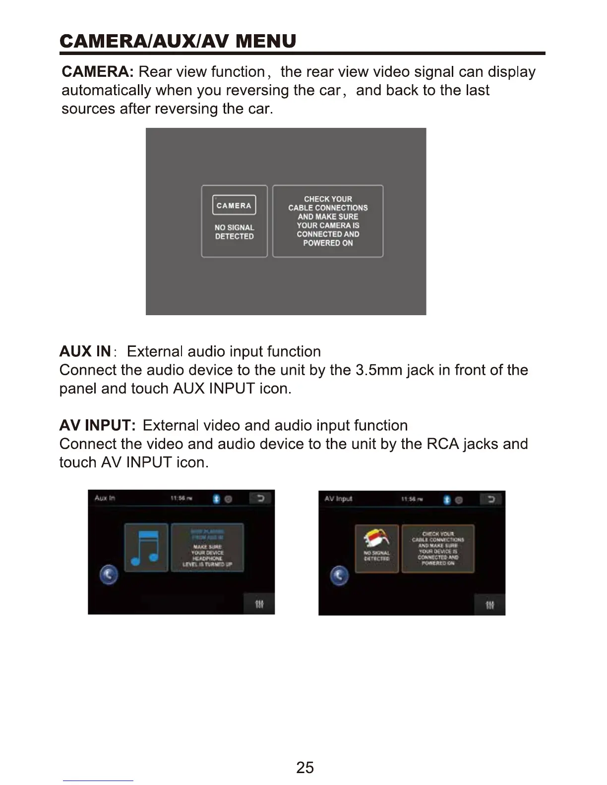 Boss BV9967B - Camera;Aux;AV Menu; Camera Functionality; AUX IN Input; AV INPUT Function