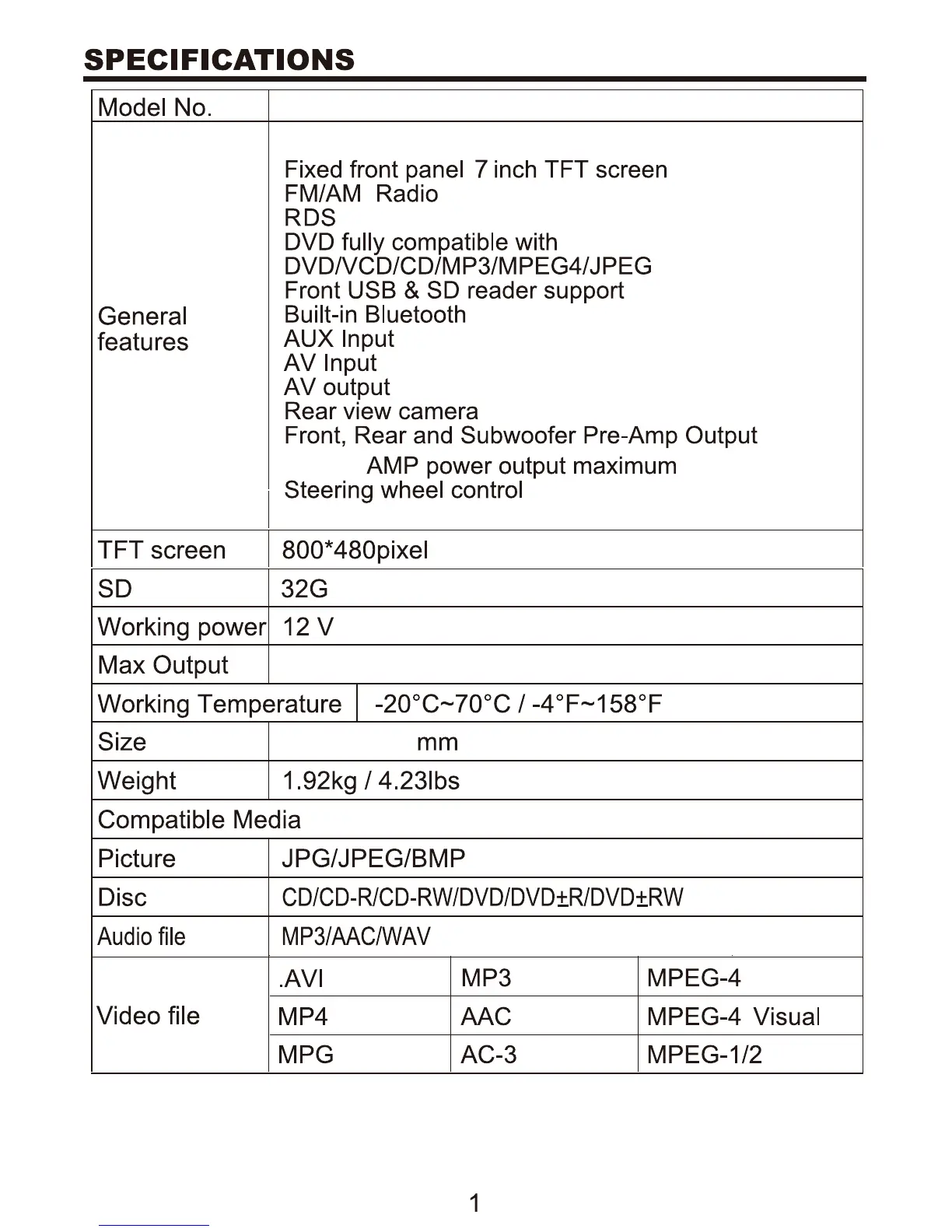 Boss BV9967B - Specifications; Model Number; General Features; TFT Screen Specifications