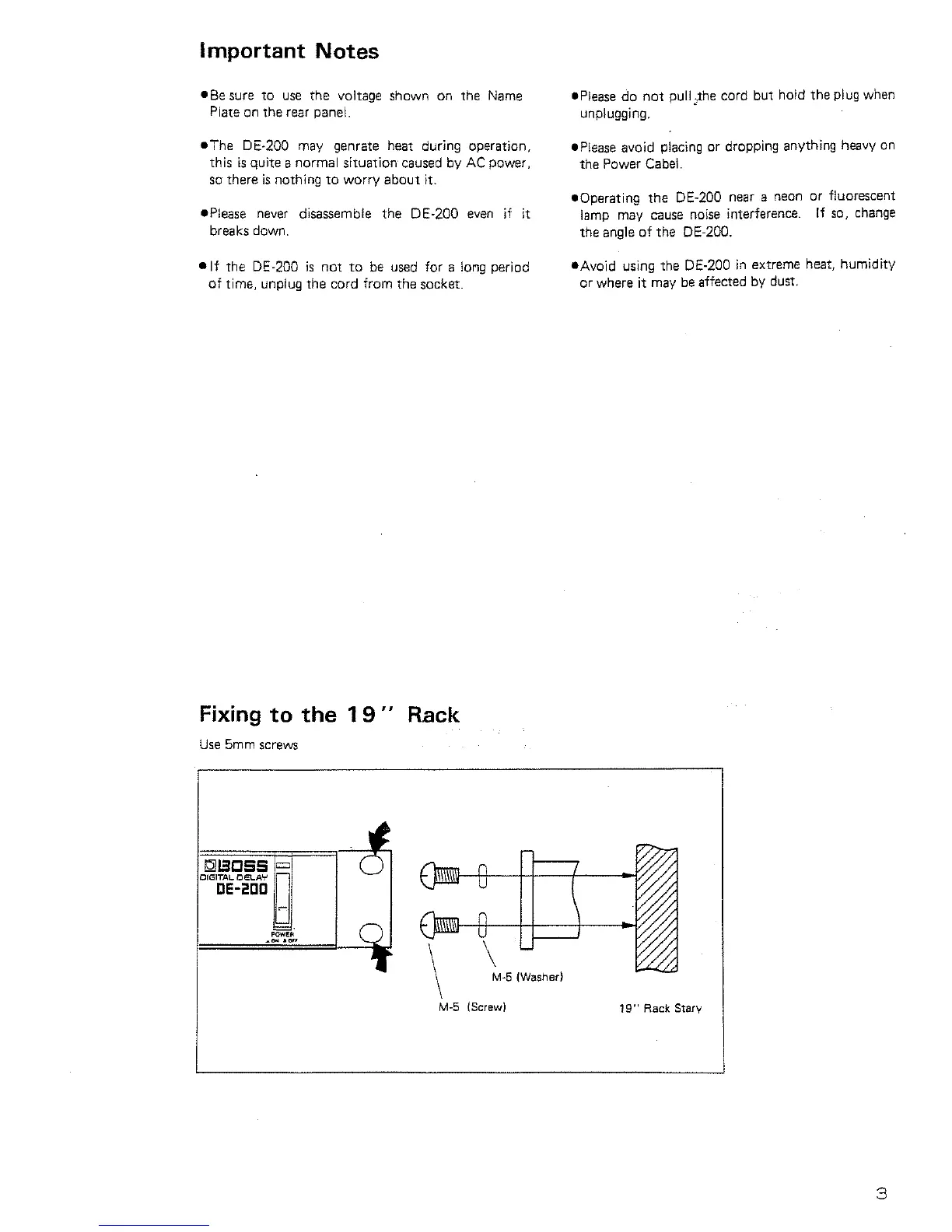 Boss Digital Delay DE-200 - Important Notes; Fixing to the 19 Rack