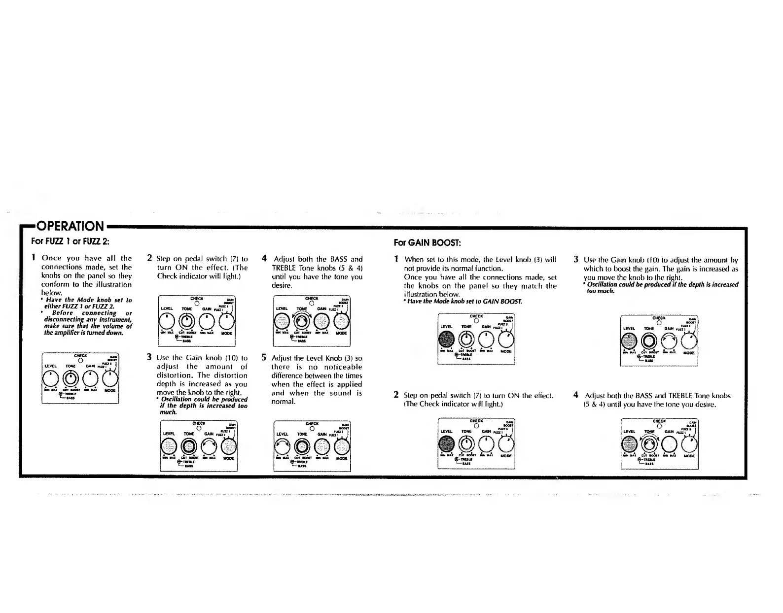 Boss FZ-2 Hyper fuzz - Operating the FZ-2 HYPER FUZZ; Operation for FUZZ 1 or FUZZ 2; Operation for GAIN BOOST