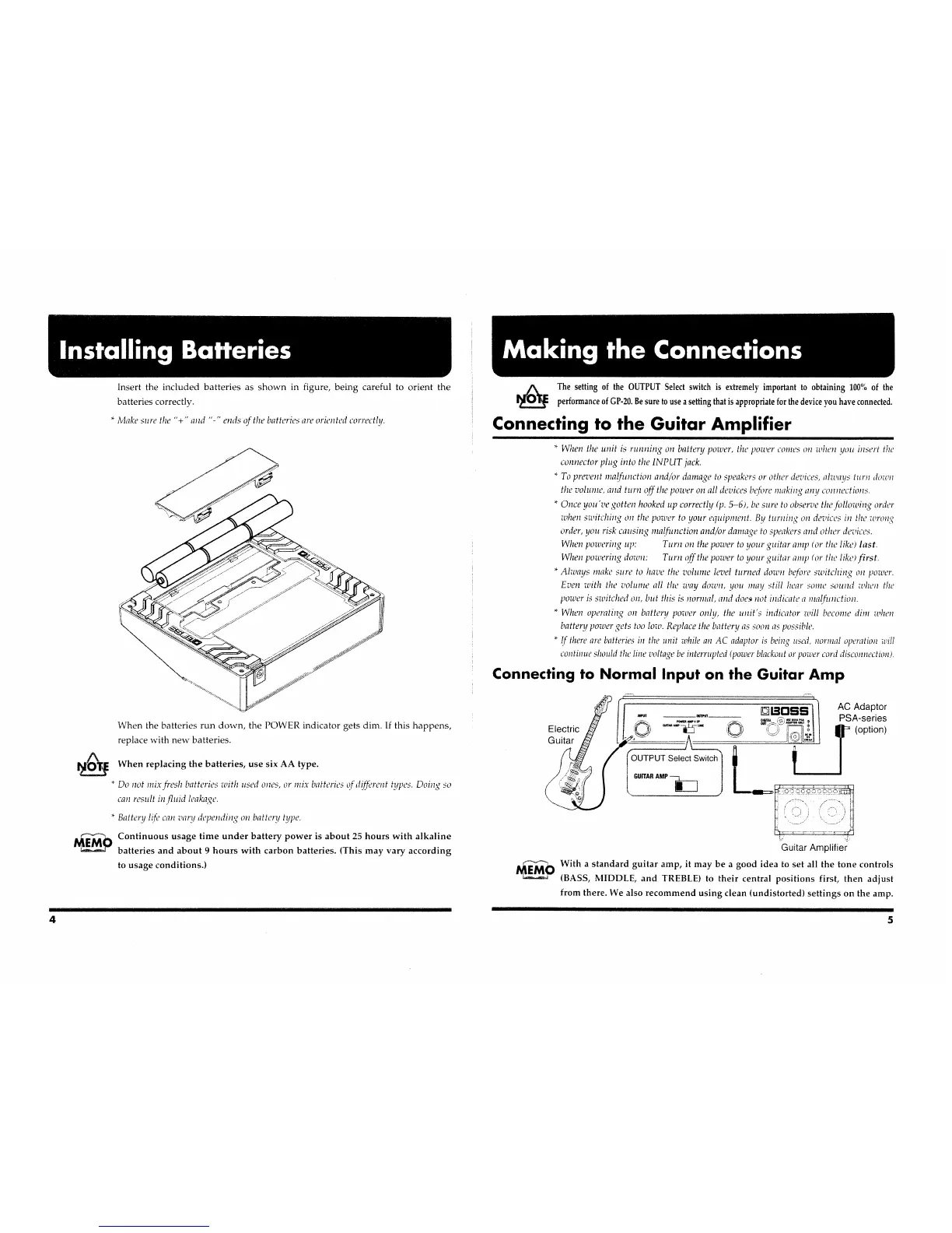 Boss GP-20 - Installing Batteries; Making the Connections; Connecting to the Guitar Amplifier; Connecting to Normal Input on Guitar Amp