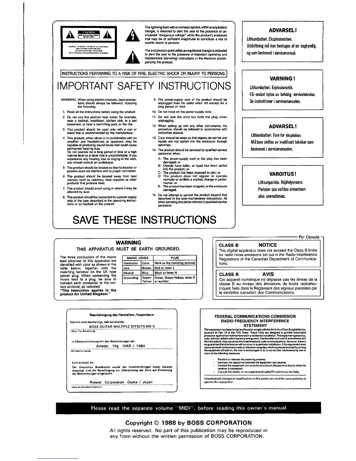 Boss ME-5 - IMPORTANT SAFETY INSTRUCTIONS