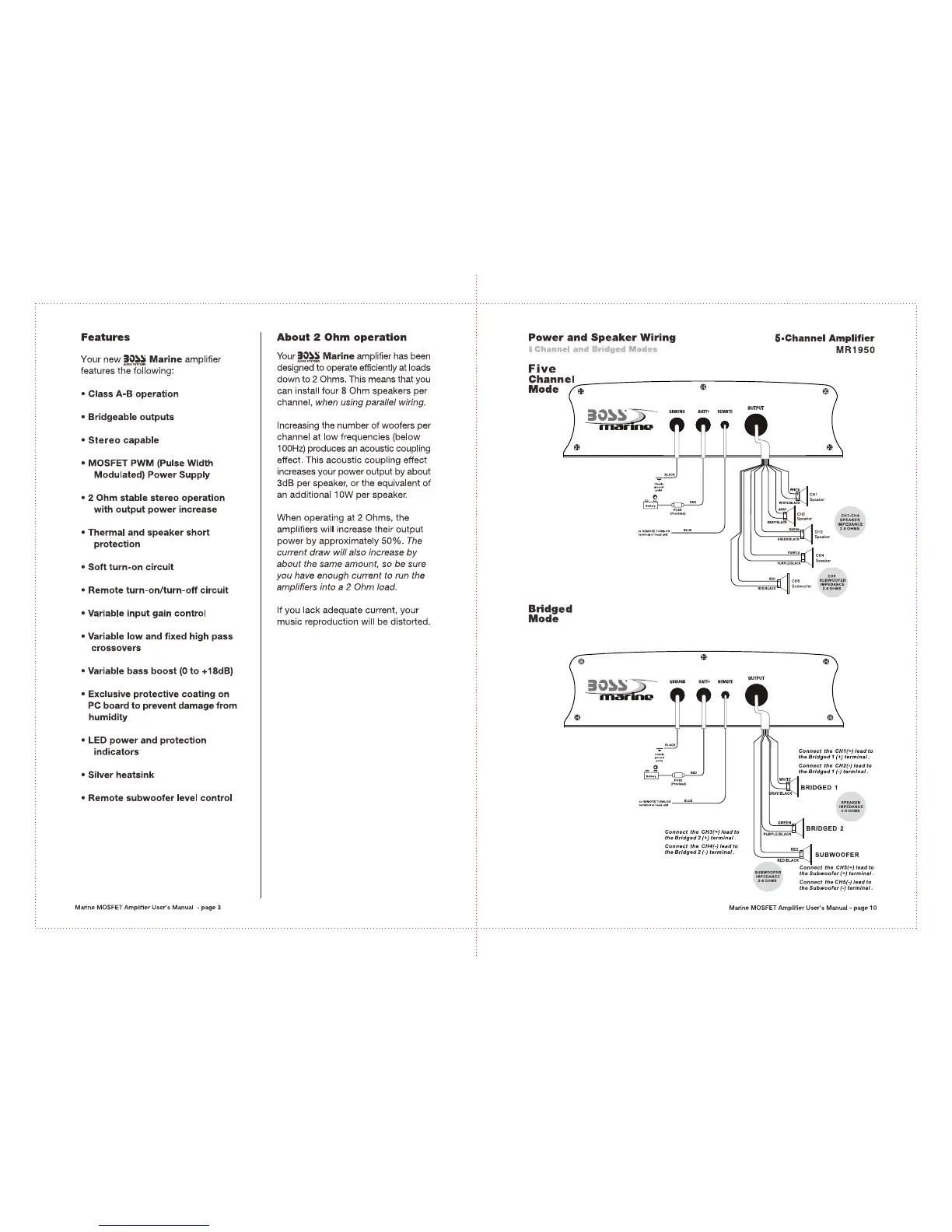 Boss MR1950 - Features; Class A-B Operation; Bridgeable Outputs; Stereo Capability