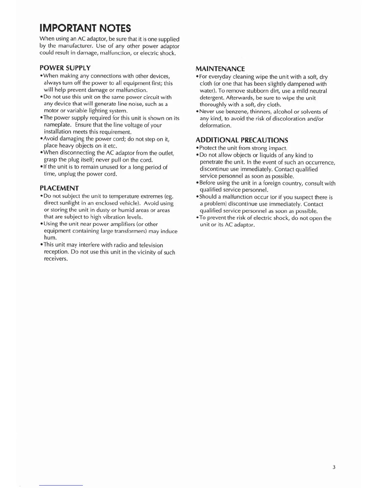 Boss MX-10 - IMPORTANT NOTES; POWER SUPPLY; PLACEMENT; MAINTENANCE